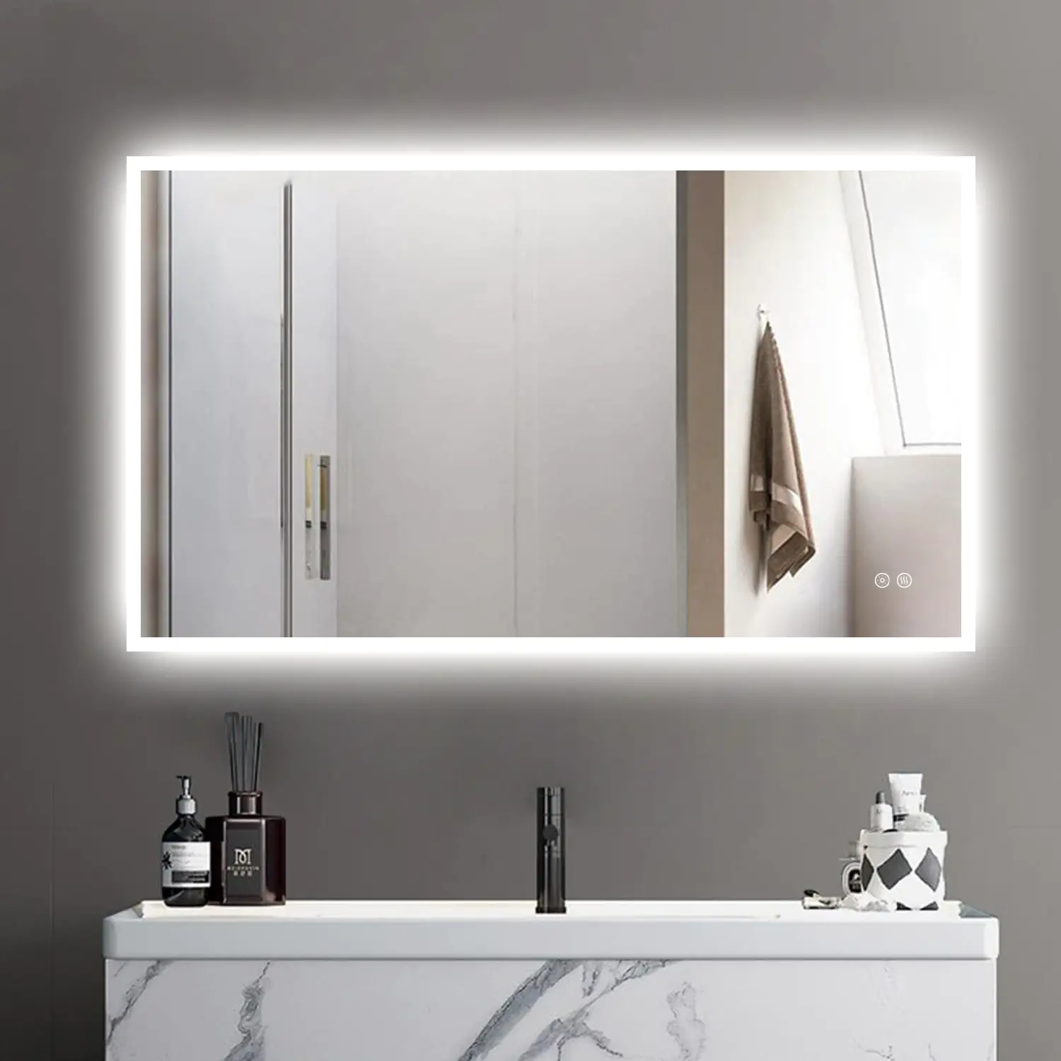 De badkamerspiegel Starlight Touch is een rechthoekige spiegel die een moderne look geeft aan jouw badkamer. De spiegel is stijlvol en functioneel door de LED verlichting. Deze led spiegel 120 cm kun je instellen op 3 verschillende kleuren en elke kleur is dimbaar. De verlichting gaat makkelijk aan via een touch bediening op de spiegel zelf. Ook de spiegelverwarming gaat via de touch bediening op de spiegel zelf.