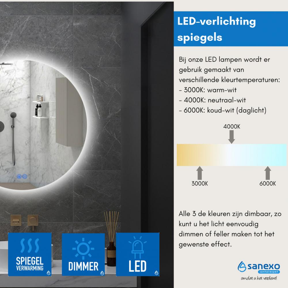 De verlichting gaat makkelijk aan via een touch bediening op de spiegel zelf. Deze LED verlichting kunt u instellen op 3 verschillende kleuren: koud wit (daglicht), neutraal wit en warm wit. Daarnaast is elke kleur ook dimbaar. Op die manier bepaalt u zelf de sterkte van de verlichting van uw badkamer.