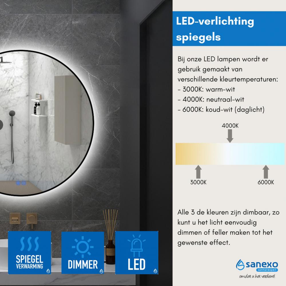 De verlichting gaat makkelijk aan via een touch bediening op de spiegel zelf. Deze LED verlichting kunt u instellen op 3 verschillende kleuren: koud wit (daglicht), neutraal wit en warm wit. Daarnaast is elke kleur ook dimbaar. Op die manier bepaalt u zelf de sterkte van de verlichting van uw badkamer.