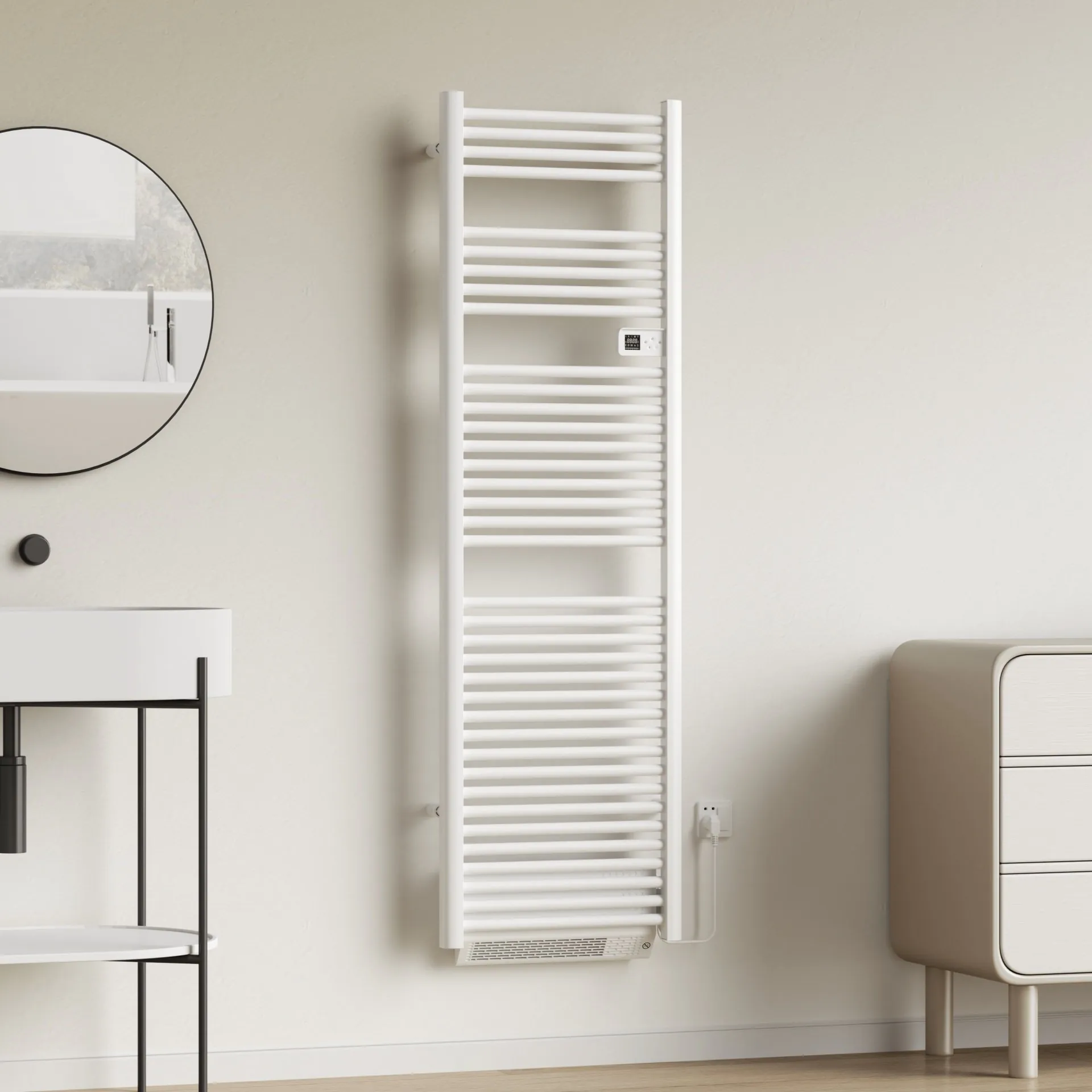 De Belrad handdoekdroger met blower in glanzend wit is een elektrische oplossing die comfort en stijl combineert. Met een vermogen van 2000 watt en een digitale, programmeerbare thermostaat biedt deze radiator aangename warmte op momenten die jij instelt. Dankzij het slanke formaat van 184x54x13,3 cm past hij moeiteloos in moderne badkamers.