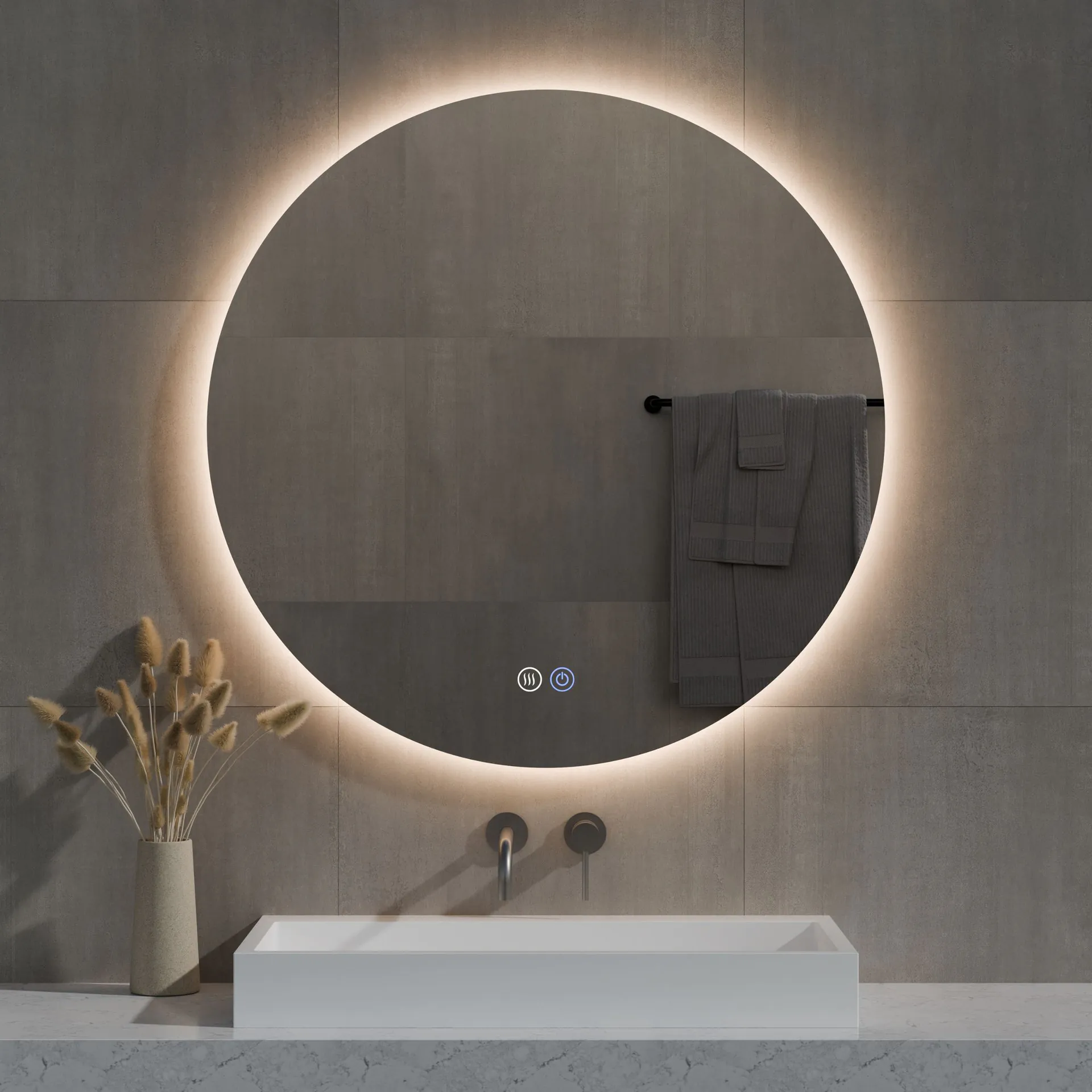 De "Aldora" spiegel is een perfecte keuze voor je badkamer. Met een diameter van Ø120 cm heeft de spiegel een strak ontwerp. De LED sfeer verlichting wordt egaal achter de spiegel verspreid en is dimbaar, met instelbare kleuren 2700K, 4000K en 6500K voor de ideale sfeer. De spiegelverwarming voorkomt condens, zodat je altijd een heldere spiegel heb