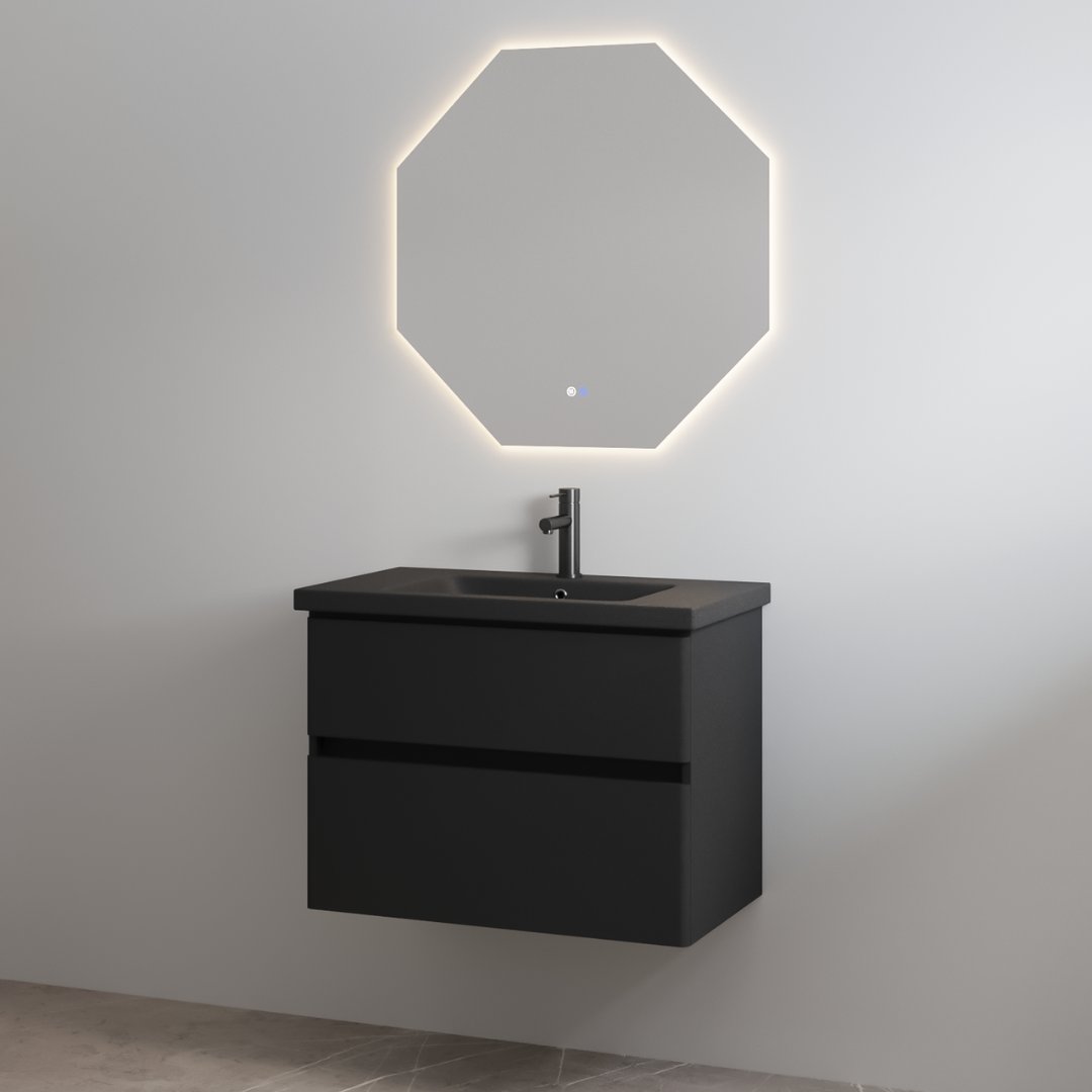 Een statement in stijl: de “Quick-Black” badkamermeubelset in volledig mat-zwart is ontworpen voor wie houdt van minimalistisch design met maximale impact. De mat-zwarte onderkast is strak, greeploos en voorzien van twee softclose laden – ideaal voor het netjes opbergen van je dagelijkse essentials. De bijpassende keramieken wastafel in mat-zwart maakt het geheel compleet en geeft de set een krachtige, moderne uitstraling. Met een centraal kraangat en geïntegreerde overloop is ook aan praktisch gemak gedacht. Deze 80 cm brede set is meer dan een meubel – het is een stijlvolle upgrade voor elke badkamer waarin zwart de hoofdrol mag spelen. Let op: de spiegel en kraan zijn niet inbegrepen bij deze set. Kleuren zijn ter indicatie en kunnen afwijken van de foto. Hieraan kunnen geen rechten worden ontleend.