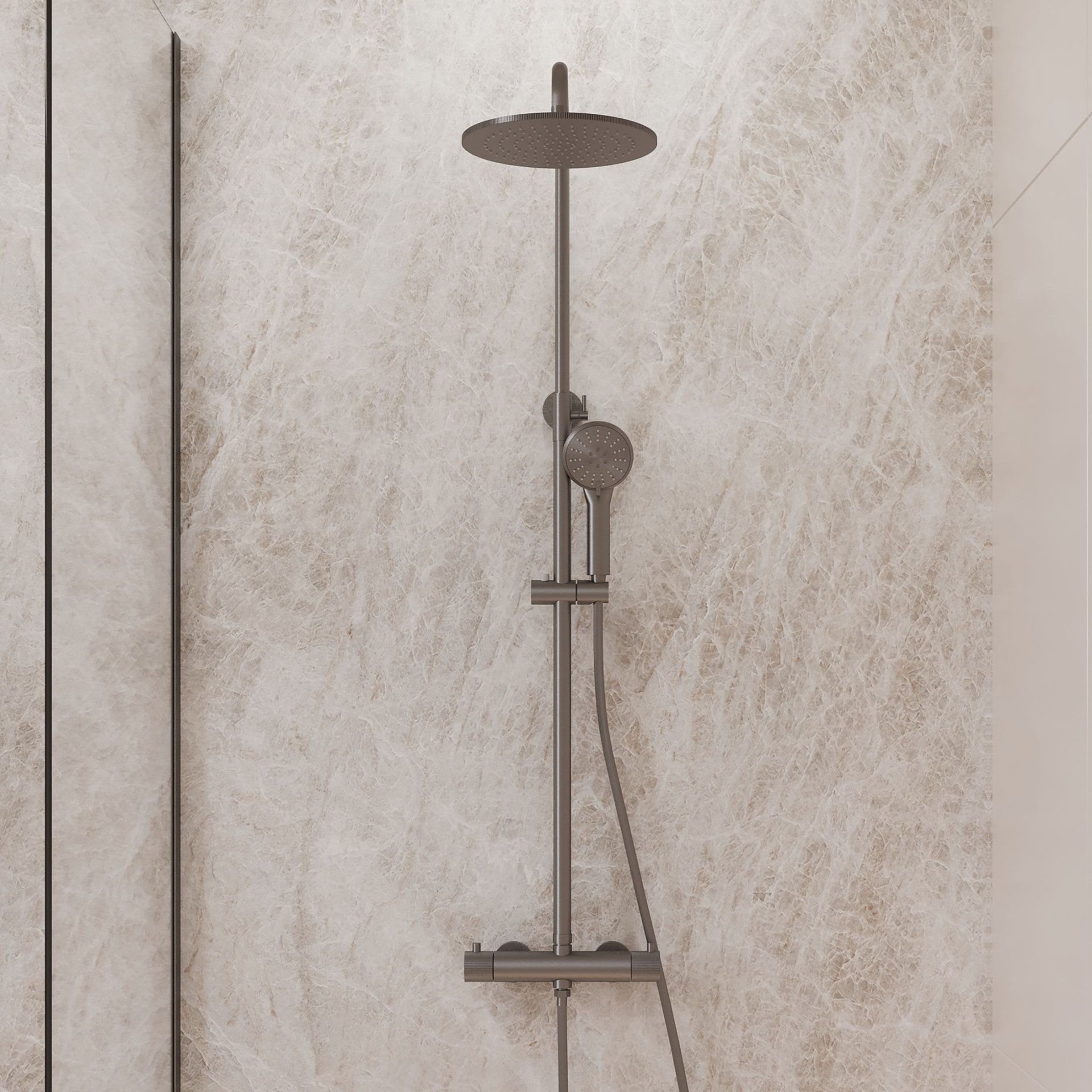 De High-End Moya regendouche-opbouwset uit de High-End collectie is ontworpen voor wie luxe en comfort wil combineren. De set is vervaardigd uit RVS en uitgevoerd in een stoere gunmetal kleur die een moderne, krachtige uitstraling in de badkamer creëert. De hoofddouche en thermostaatknoppen zijn voorzien van een stijlvol geribbeld reliëf dat de afwerking extra karakter geeft. De handdouche beschikt over drie standen, zodat je moeiteloos wisselt tussen verschillende straalsoorten voor een optimale douche-ervaring. De hoofddouche beschikt over een waterbesparende functie en een geïntegreerde airbooster, terwijl de handdouche eveneens is voorzien van een waterbesparende functie. Vind je de waterbesparende functie toch niet prettig? Dan kun je deze eenvoudig verwijderen. Kleuren zijn ter indicatie kunnen afwijken van de foto, hieraan kunnen geen rechten worden ontleend