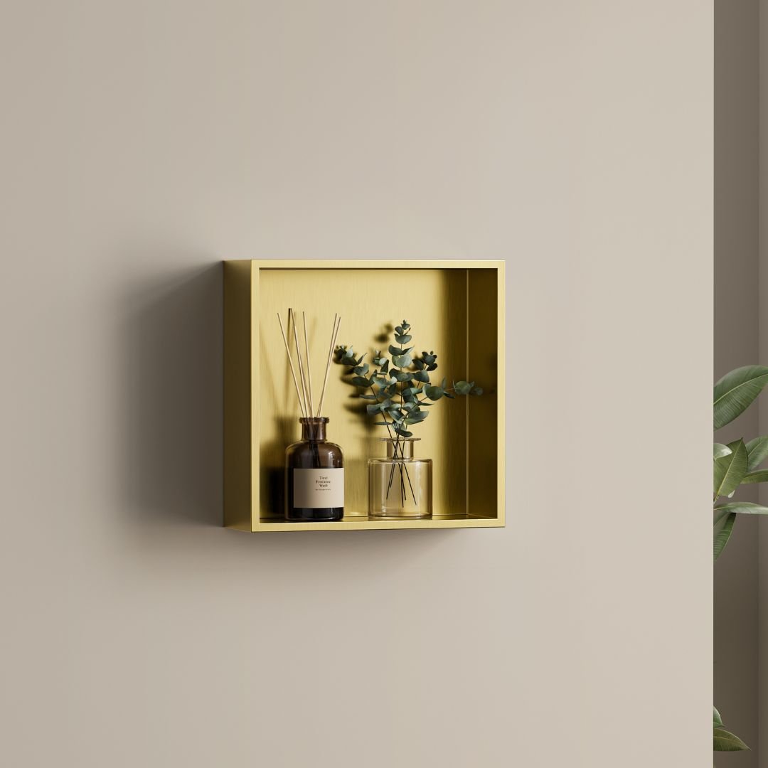 De "Logy" opbouwnis in mat-goud is een stijlvol en functioneel accessoire voor je badkamer of toilet. Met zijn minimalistische vormgeving en matte afwerking voegt deze nis een moderne, elegante touch toe aan elke ruimte. De nis meet 30 x 30 cm, waardoor er voldoende ruimte is voor het opbergen van verzorgingsproducten, douchebenodigdheden of decoratieve items. De opbouwnis wordt eenvoudig direct tegen de muur gemonteerd, zonder dat inbouw of breekwerk nodig is. Dankzij het strakke ontwerp past de "Logy" opbouwnis moeiteloos in uiteenlopende interieurstijlen. Kleuren zijn ter indicatie en kunnen afwijken van de foto. Hieraan kunnen geen rechten worden ontleend.