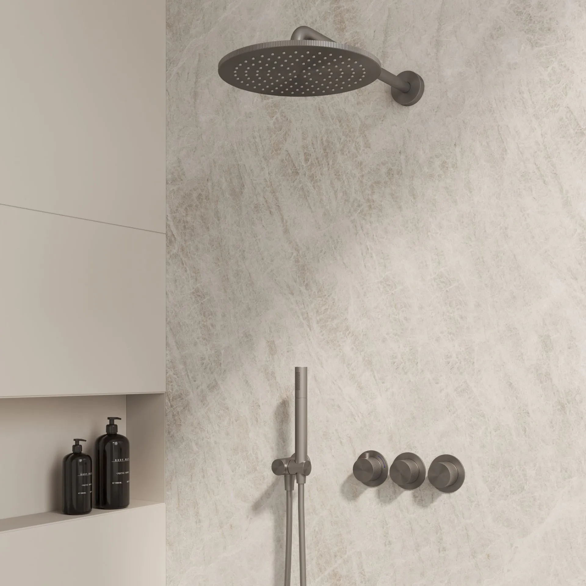 De High-End Moya M-250 inbouw-regendoucheset heeft een karaktervolle uitstraling dankzij de gunmetal afwerking en gemaakt van RVS. Deze kleur brengt een subtiel industriële, maar toch verfijnde sfeer in de badkamer. Zowel de hoofddouche als de bedieningsknoppen van de inbouwthermostaat zijn uitgerust met een elegant geribbeld reliëf. De hoofddouche beschikt over een waterbesparende functie (indien gewenst verwijderbaar) en een geïntegreerde Airbooster. De opsteekmuuraansluiting is bovendien kantelbaar, wat flexibiliteit biedt in de positie van de handdouche. De set bestaat uit: inbouwthermostaat (art. nr. 4018350), kantelbare opsteekmuuraansluiting (art. nr. 4023450), handdouche (art. nr. 4008630), doucheslang (art. nr. 4023040), muurbeugel (art. nr. 4016030) en regendouche (art. nr. 4023010). Verpakt in doos met kleuren sticker Kleuren zijn ter indicatie kunnen afwijken van de foto, hieraan kunnen geen rechten worden ontleend.