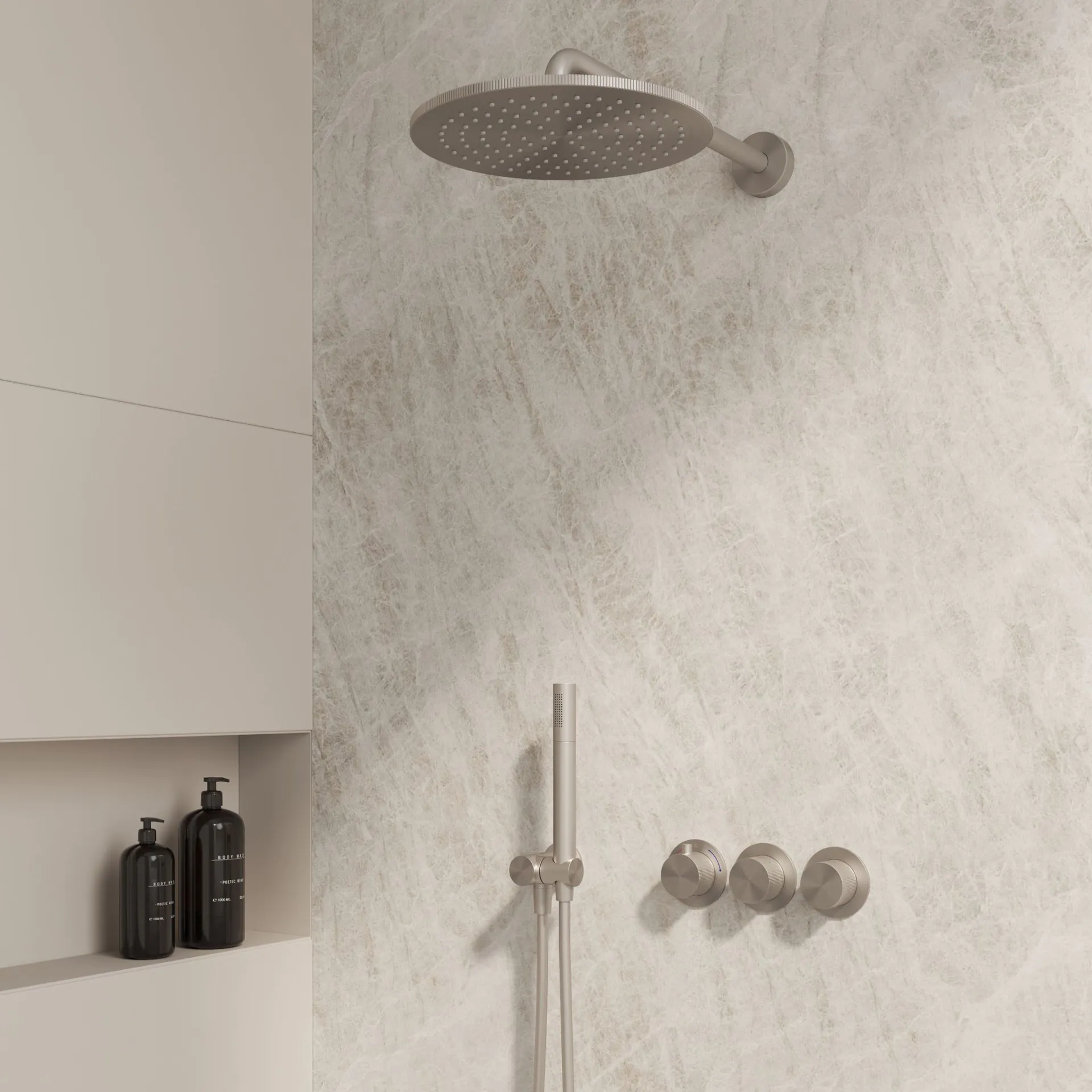 De High-End Ore M-250 inbouw-regendoucheset heeft een tijdloze en veelzijdige uitstraling dankzij de RVS-afwerking en is gemaakt van RVS. Deze neutrale kleur past moeiteloos in uiteenlopende badkamerstijlen, van modern tot klassiek. Zowel de hoofddouche als de bedieningsknoppen van de inbouwthermostaat zijn uitgerust met een elegant geribbeld reliëf. De hoofddouche beschikt over een waterbesparende functie (indien gewenst verwijderbaar) en een geïntegreerde Airbooster. De opsteekmuuraansluiting is bovendien kantelbaar, wat flexibiliteit biedt in de positie van de handdouche. De set bestaat uit: inbouwthermostaat (art. nr. 4018360), kantelbare opsteekmuuraansluiting (art. nr. 4023410), handdouche (art. nr. 3814020), doucheslang (art. nr. 3801111), muurbeugel (art. nr. 4015990) en regendouche (art. nr. 4022970). Verpakt in doos met kleuren sticker Kleuren zijn ter indicatie kunnen afwijken van de foto, hieraan kunnen geen rechten worden ontleend.