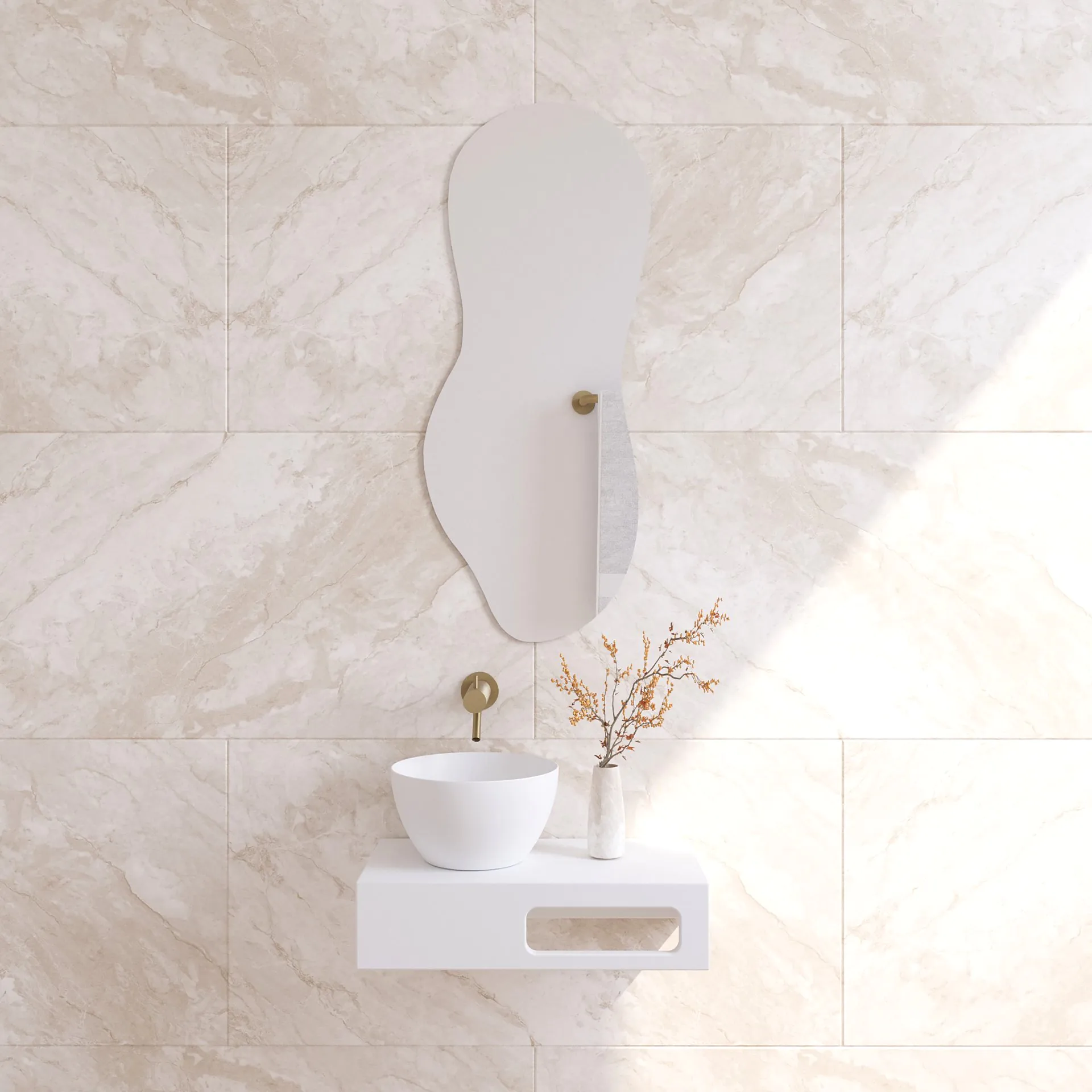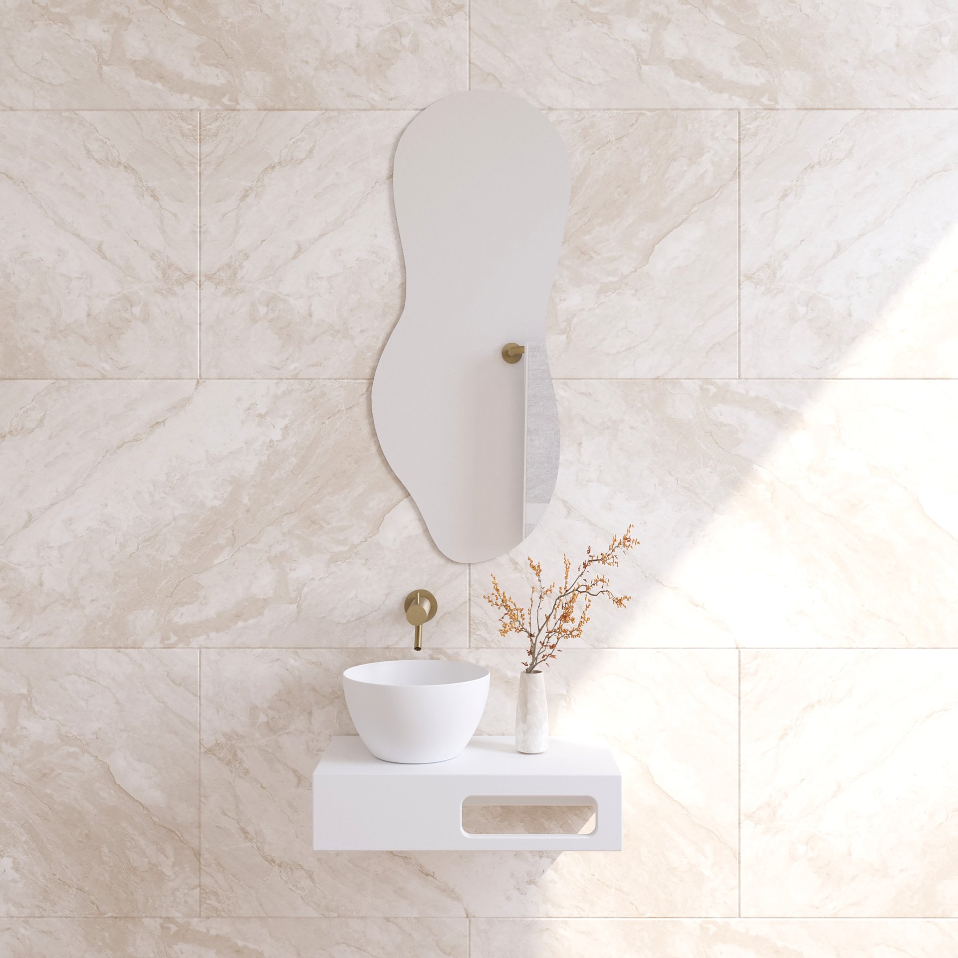 De “Oslo” spiegel is een stijlvolle keuze voor kleinere ruimtes zoals het toilet of de hal. Dankzij de organische vorm en het compacte formaat van 30x70 cm past hij gemakkelijk op smalle wanden. Het randloze ontwerp geeft de spiegel een rustige, verfijnde uitstraling en laat zich eenvoudig combineren met verschillende interieurstijlen. Door zijn lichte en slanke ontwerp is de “Oslo” eenvoudig op te hangen en flexibel in gebruik. Een subtiele, maar doordachte toevoeging voor wie houdt van eenvoud met een helder effect.