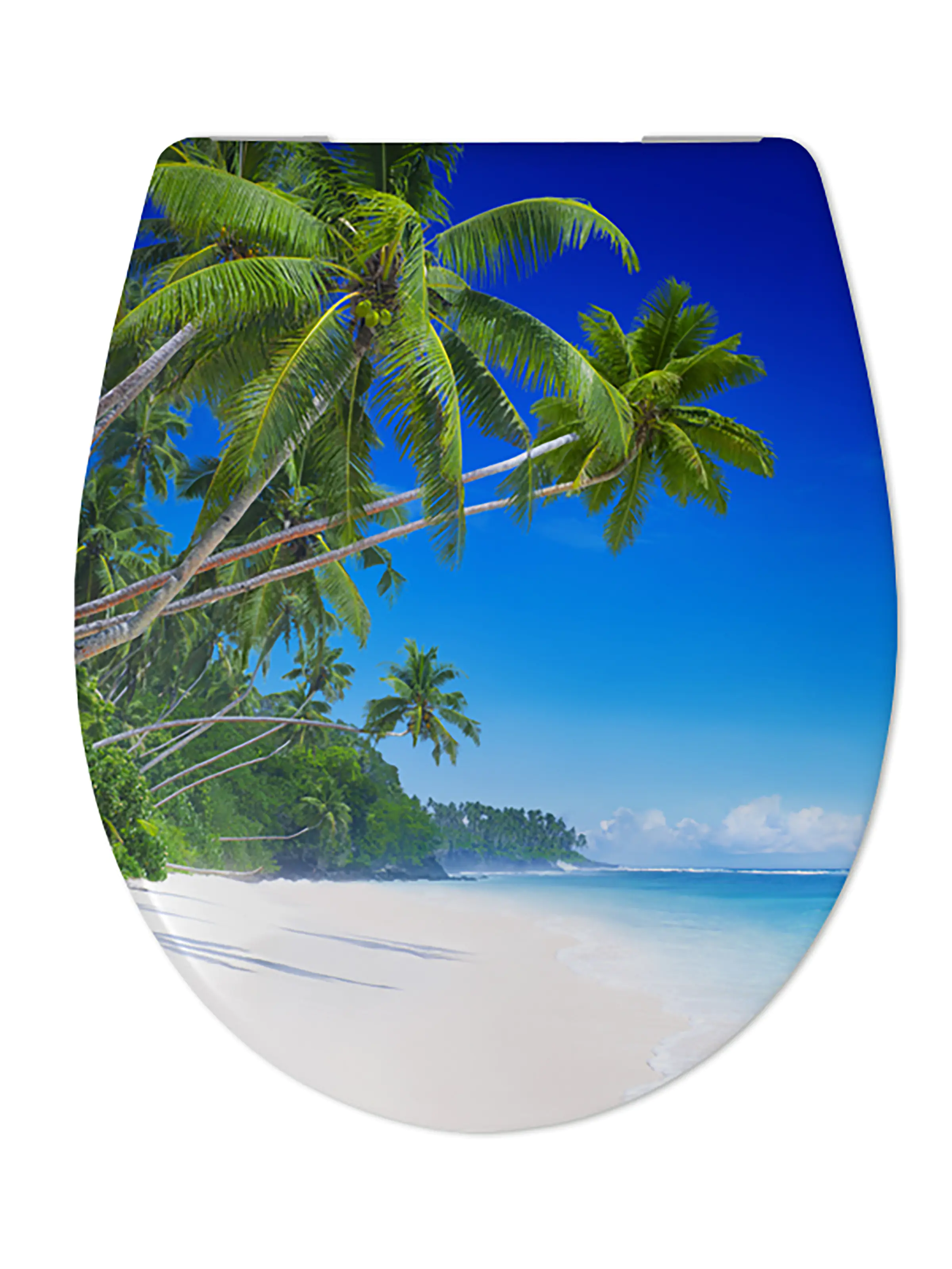 Cedo Tropical Toiletzitting/siège wc Multi Waar kan je beter even wegdromen dan op het kleinste kamertje? Deze Cedo Tropical wc-bril neemt je mee naar een prachtig afgelegen zandstrand, maar dat is lang niet alles. De wc-bril is gemaakt van duroplast, hierdoor is hij krasvast en nagenoeg onbreekbaar ,waardoor je er jarenlang plezier van hebt en door het gladde oppervlak is hij ook makkelijk schoon te houden. De speciale soft-close scharnieren zorgen ervoor dat de bril en deksel altijd zachtjes en geruisloos dichtvallen en voorkomen dat de keramische toiletpot beschadigd raakt. Daarnaast is de wc-bril door het ingebouwde 'Take off' systeem met een eenvoudige beweging los te klikken ,waardoor ieder lastig hoekje eenvoudig schoon te maken is. Erg handig dus. Door de verstelbaarheid in de scharnieren en de ovale vorm past de bril op de meeste gangbare toiletpotten, toch raden we je aan de lijntekening goed te bekijken zodat hij netjes past op jouw pot. Tenslotte monteer je de bril met het doordachte 'Fastfix' bevestigingssysteem eenvoudig vanaf de onderkant. Omdat we duurzaamheid belangrijk vinden, wordt de wc-bril in Europa geproduceerd ,waardoor we de transportketen kort houden en zo bijdragen aan een beter milieu en je een hoogwaardig product met een lange levensduur garanderen. Kortom, met deze Cedo wc-bril zit je goed.