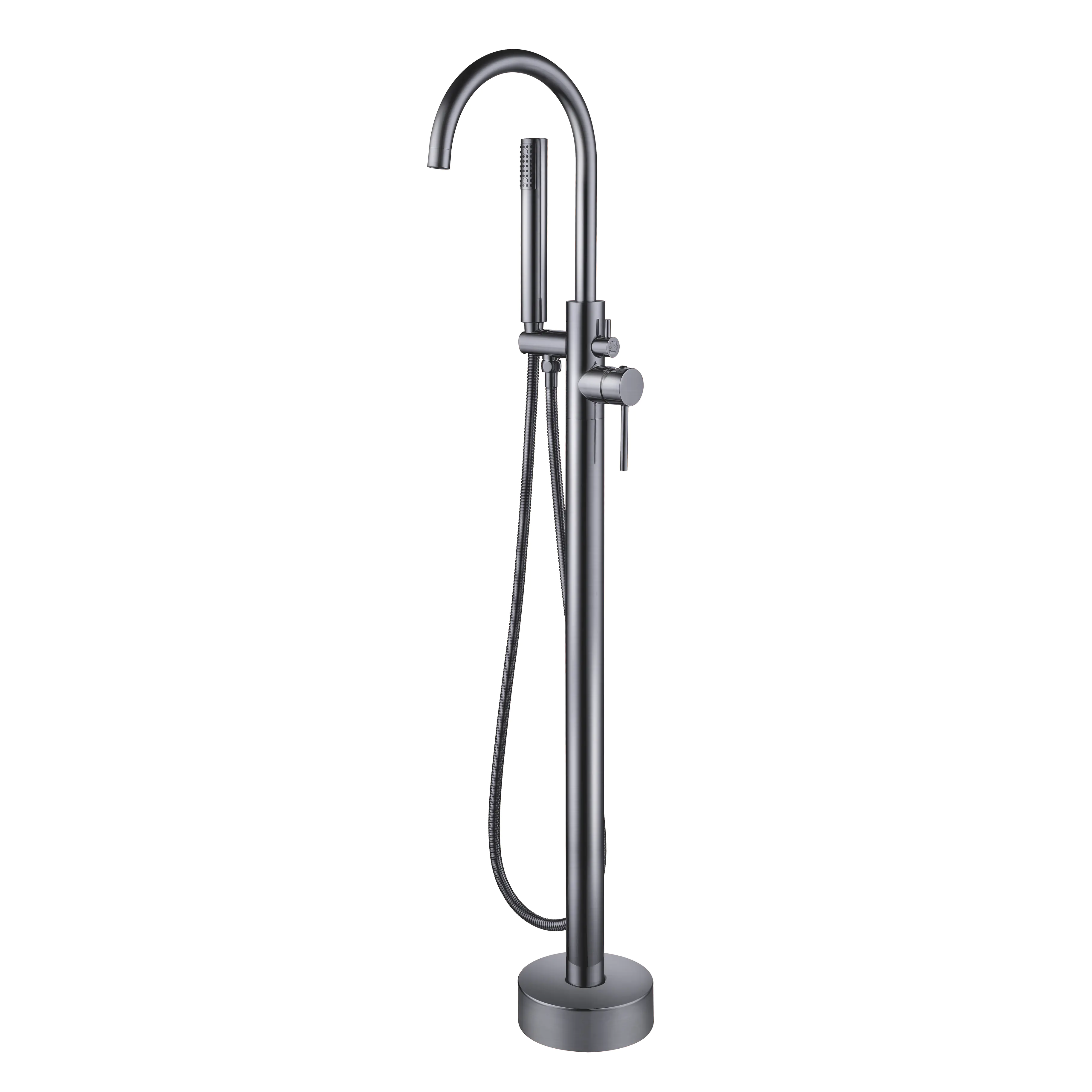 Een vrijstaande badkraan is de modernste en meest trendy product voor nu. Een badkraan vrijstaand is een badkraan die gemonteerd wordt naast uw ligbad. Dit geeft de badkraan een prominente positie in de badkamer. De Aloni vrijstaand badmengkraan is een stjlvolle vrijstaande badkraan met een handdouche in diverse kleuren. De bediening van de Aloni vrijstaande badkraan is zeer eenvoudig vanwege de keramische schijven die verwerkt zijn in het binnenwerk. Dit zorgt tevens voor een lange levensduur. Bij de ALoni vijrstaand badmengkraan wordt geleverd met een handdouche. Deze is, net als de badkraan, gemaakt van messing. Een stevig materiaal wat zeer goed in natte ruimtes gebruikt kan worden. De handdouche vorm is gelijk als de vorm van de badkraan, zeer elegant en stijlvol. De handdouche is voorzien van siliconen sproeigaatjes. Deze zijn eenvoudig te ontkalken. De kraan is voorzien van twee hendels: één om de temperatuur te regelen en één om de de wisselen tussen de badkraan en de handdouche. De temperatuur en het volume van de kraan zijn met één beweging in te stellen.