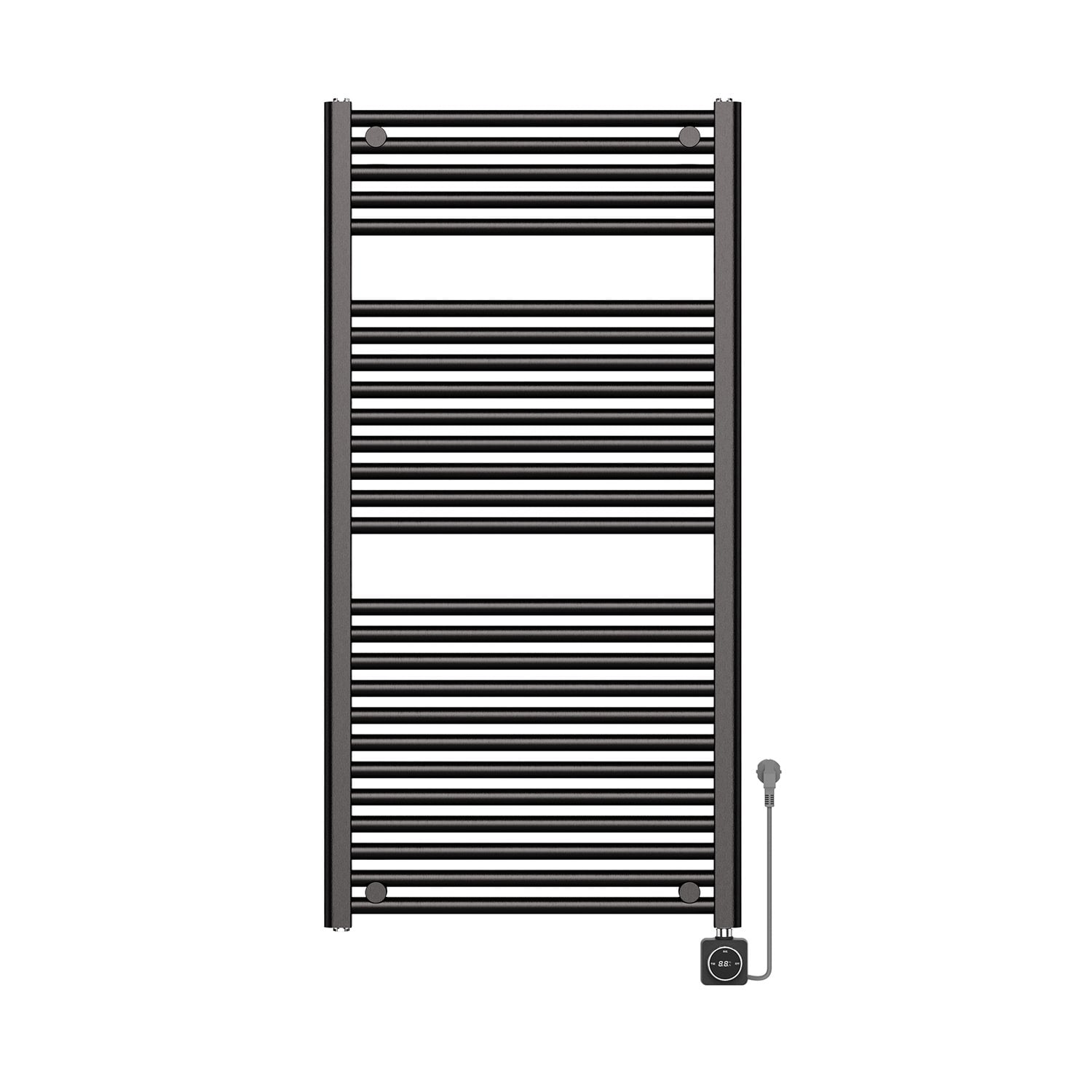Dit is een elektrische radiator van het merk Elara. Efficiënt 900 W model, breed gunmetal PVD ontwerp, IPX4, programmeerbaar via WiFi voor optimale badkamerverwarming.