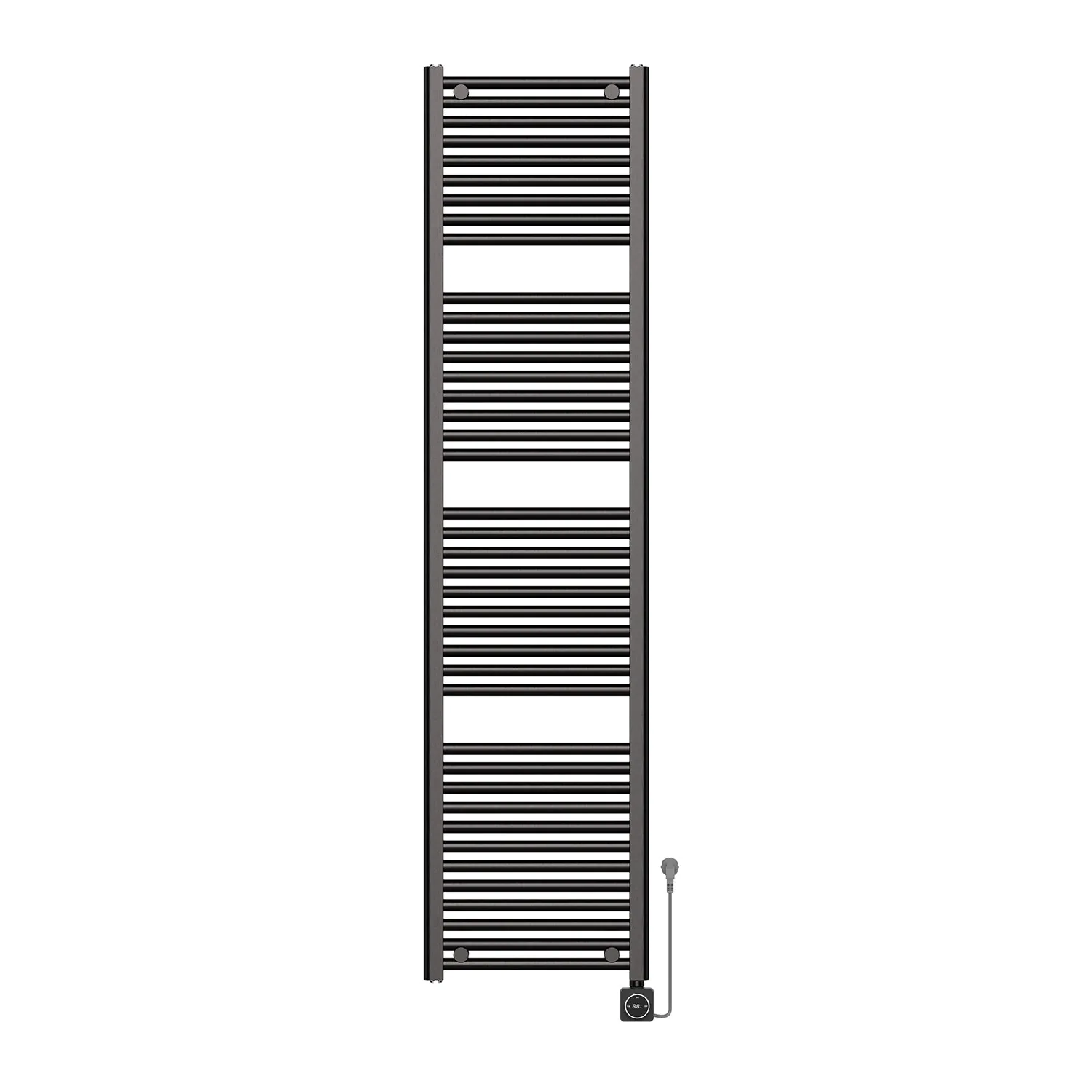 Dit is een elektrische radiator van het merk Elara. Slim bedienbaar via WiFi, 1000 W vermogen, gunmetal PVD en spatwaterdicht (IPX4) voor badkamercomfort.