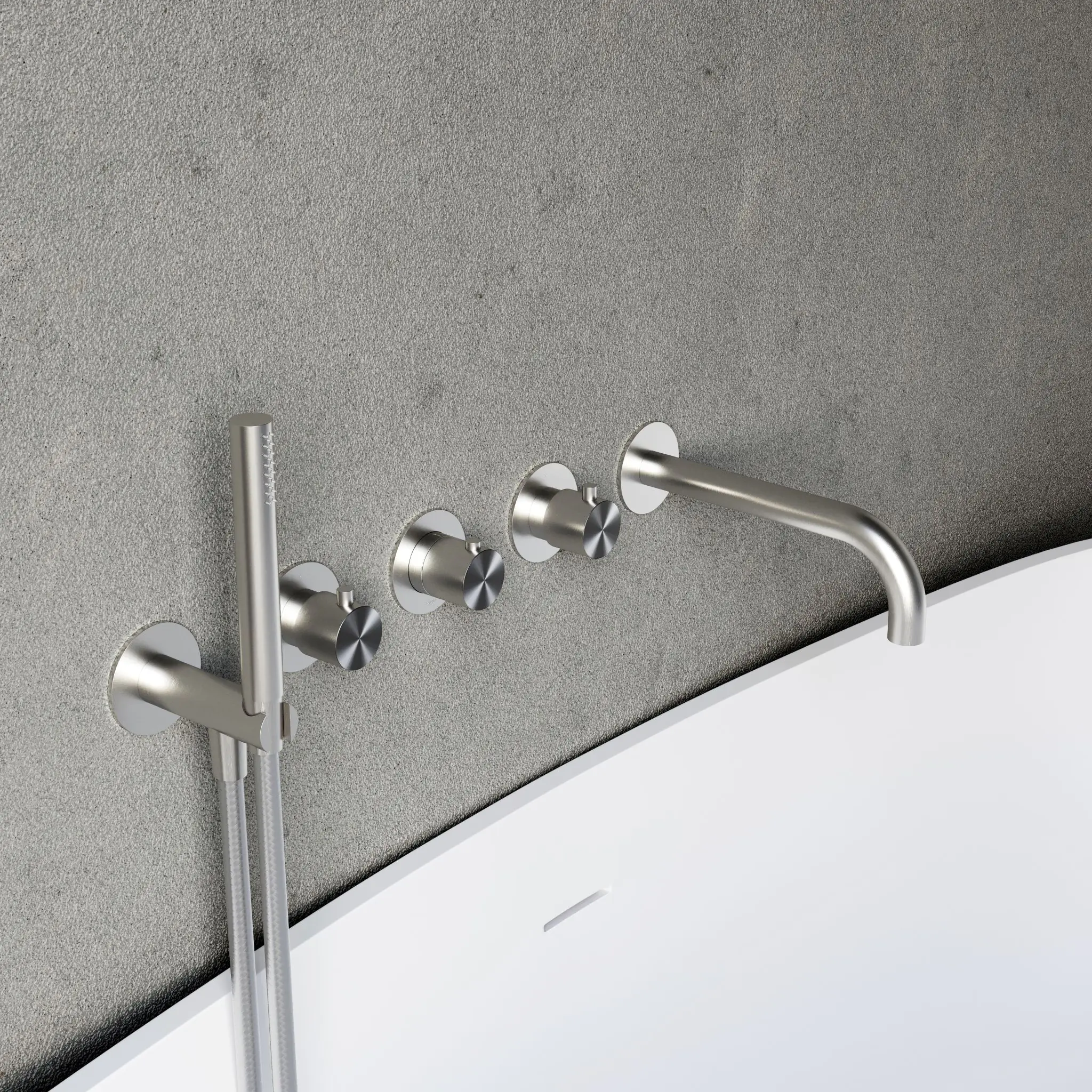 Dit afbouwdeel is door het uiterlijk en materiaal een stijlvolle aanvulling voor elke badkamer. Het is gemaakt in de kleur RVS316, dat zorgt voor een strak design. Dit afbouwdeel bestaat uit twee stopkranen, drie knoppen, een staaf handdouche en een uitloop. Het is geschikt is voor een bad inbouwthermostaat met 2-weg omstel. De thermostaat kan namelijk toegepast worden op de baduitloop en de handdouche. De handdouche kan zowel links als rechts geplaatst worden door de inbouwbox om te draaien. Let er op dat de inbouwbox apart besteld moet worden. Het is een thermostaatkraan. Hiermee kunt u dus zelf makkelijk de gewenste temperatuur instellen. U regelt zelf de temperatuur en deze blijft onveranderd, ook als de waterdruk wordt gewijzigd. Dit afbouwdeel is 12 cm hoog en 43.7 cm breed. De rozetten zijn inclusief en zorgen voor een mooie afwerking. Het is gemaakt van RVS316. Dat is roestvrij staal dat bestand is tegen vocht, hoge temperaturen en vuil. Het is heel hygiënisch en ook nog eens makkelijk schoon te maken. Het afbouwdeel is te combineren met inbouwdeel HBCB7072. Zowel het inbouwdeel als afbouwdeel moeten besteld worden. Het wordt niet samen geleverd.