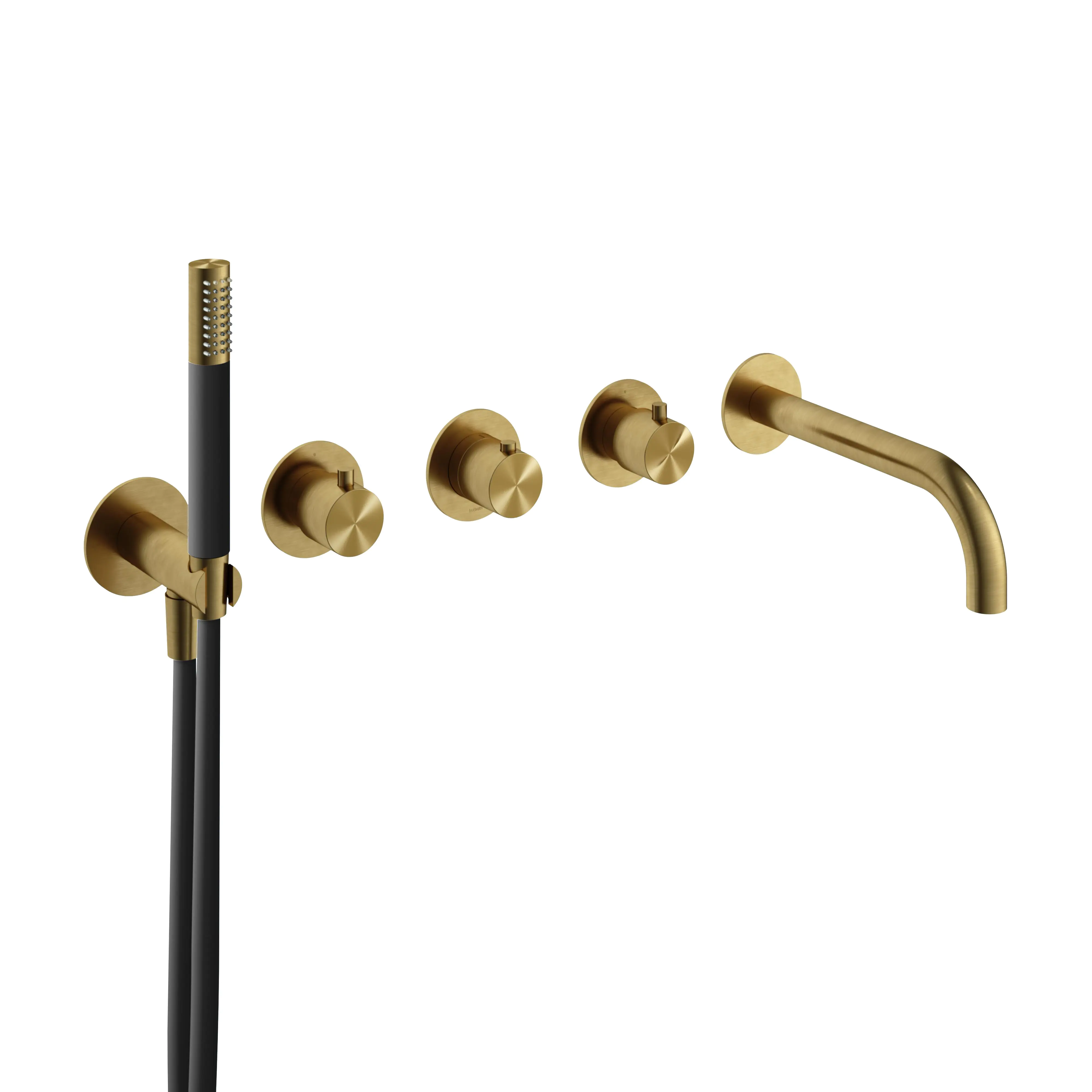 Hotbath Archie Afbouwdeel - Inbouw Thermostaat Met 2 Stopkranen, Uitloop En Handdoucheset Met Opsteek Muuraansluiting Geborsteld Messing PVD