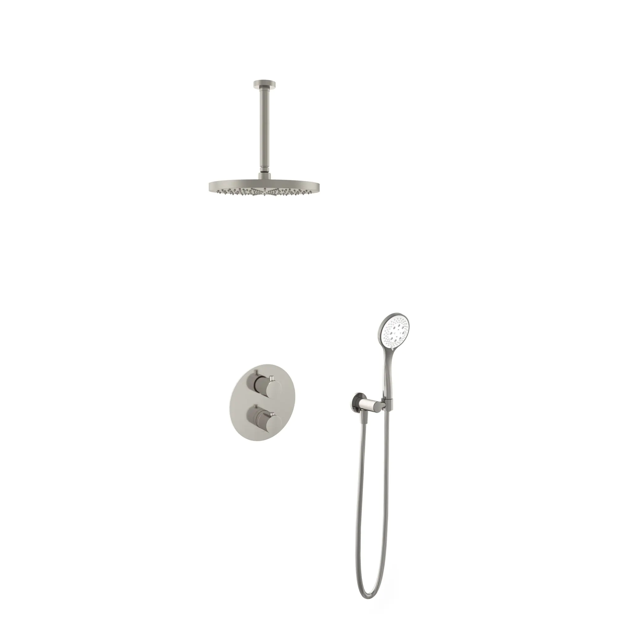 Deze complete regendoucheset van Hotbath Buddy kunt u precies samenstellen zoals u dat wenst. Het afbouwdeel is voorzien van 2 draaiknoppen: één voor de watertemperatuur en één om te bepalen of het water uit de hoofddouche of uit de staafhanddouche moet stromen. Iedere set wordt geleverd met de gehele inbouwbox en externe schakelaars. De set is verkrijgbaar in verschillende kleuren. Deze set is voorzien van een plafondbuis 30 cm, hoofddouche 30 cm en een 3 standen handdouche. Let op: De hoofddouches met een diameter 20 cm hebben minimaal een CW3 ketel nodig om dit systeem zo goed mogelijk te laten werken. Voor hoofddouches met een diameter van 25 cm of groter, geldt een CW4 systeem of hoger.