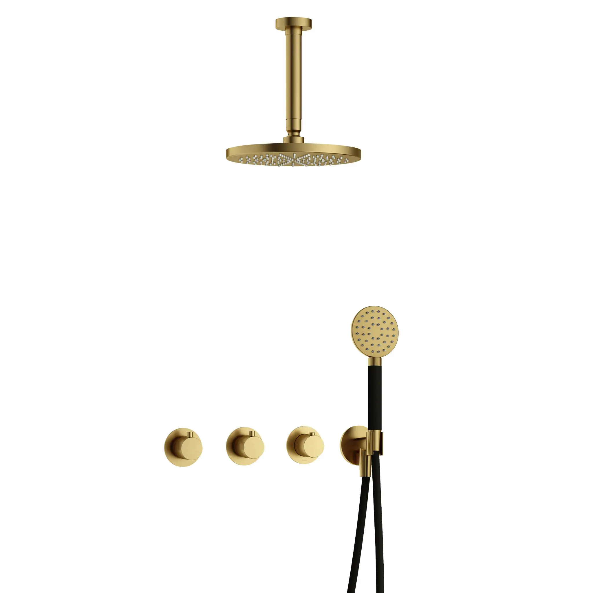 Hotbath Cobber Inbouw Regendoucheset Met Thermostaatkraan, 2 Stopkranen, Plafondbuis 15cm, Hoofddouche 20cm En 3-Standen Handdouche Geborsteld Messing PVD