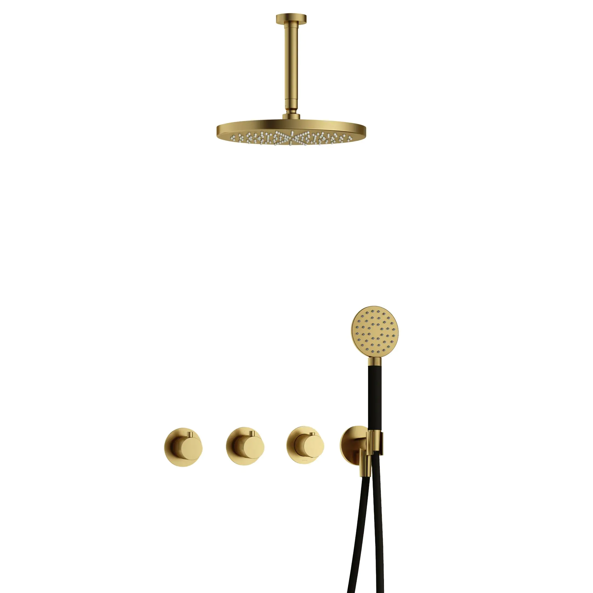 Hotbath Cobber Inbouw Regendoucheset Met Thermostaatkraan, 2 Stopkranen, Plafondbuis 15cm, Hoofddouche 30cm En 3-Standen Handdouche Geborsteld Messing PVD