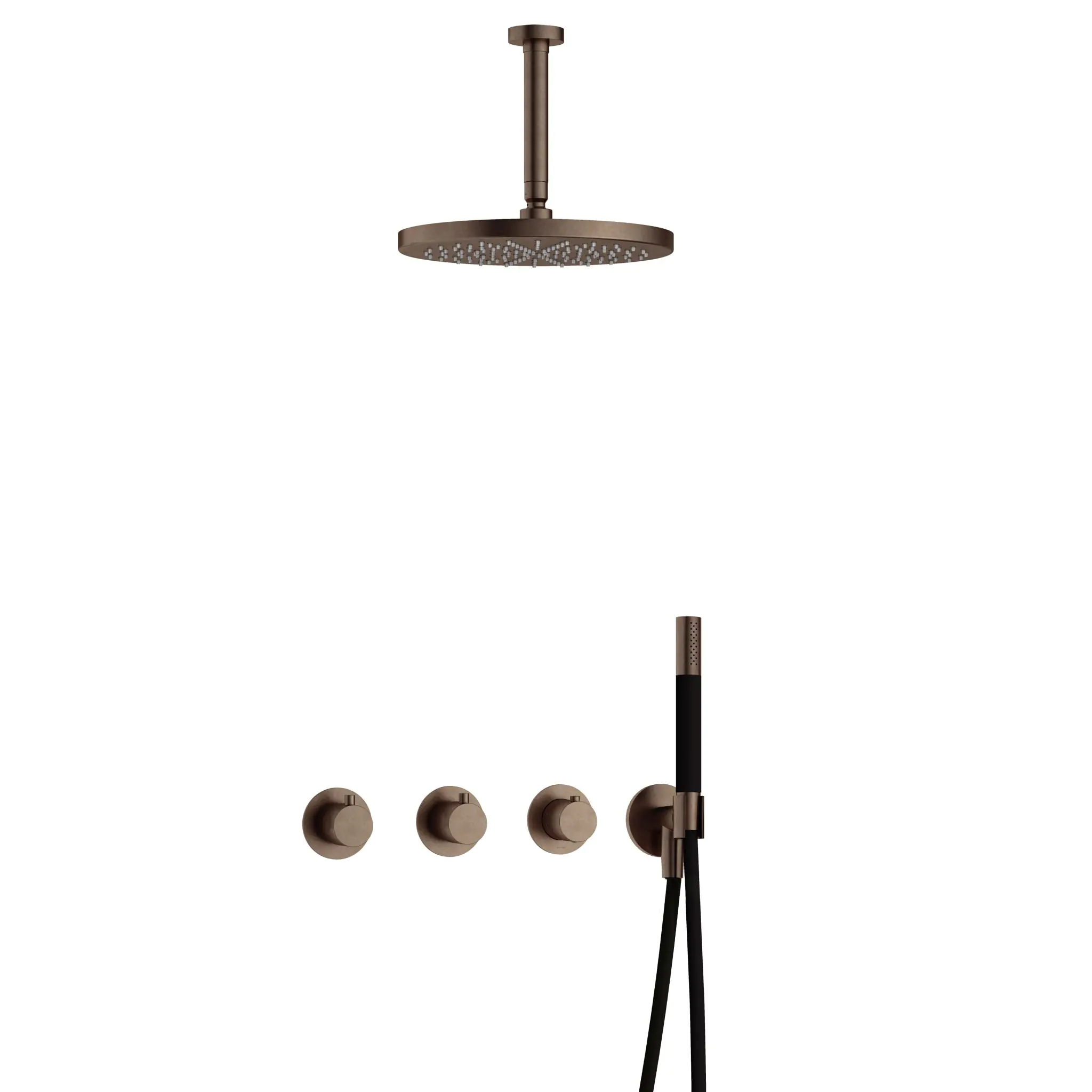 Deze complete regendoucheset van Hotbath uit de serie Cobber kunt u precies samenstellen zoals u dat wenst. Het afbouwdeel is voorzien van 3 draaiknoppen: een voor de watertemperatuur en een om te bepalen of het water uit de hoofddouche of uit de handdouche te laten stromen. Iedere set wordt geleverd met de gehele inbouwbox en externe schakelaars. De set is verkrijgbaar in verschillende kleuren. Deze set is voorzien van een plafondbuis 15 cm, hoofddouche 30 cm en een staafhanddouche. Let op: De hoofddouches met een diameter 20 cm hebben minimaal een CW3 ketel nodig om dit systeem zo goed mogelijk te laten werken. Voor hoofddouches met een diameter van 25 cm of groter, geldt een CW4 systeem of hoger.
