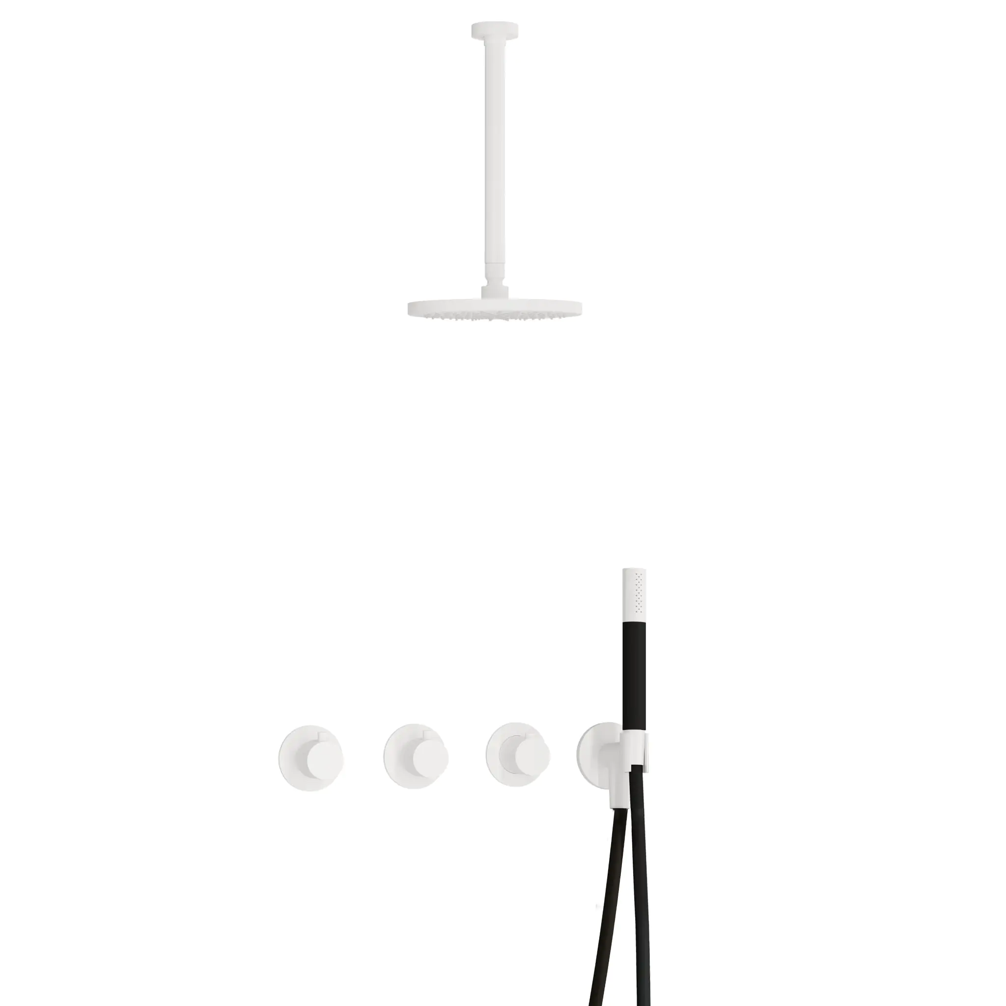 Deze complete regendoucheset van Hotbath uit de serie Cobber kunt u precies samenstellen zoals u dat wenst. Het afbouwdeel is voorzien van 3 draaiknoppen: een voor de watertemperatuur en een om te bepalen of het water uit de hoofddouche of uit de handdouche te laten stromen. Iedere set wordt geleverd met de gehele inbouwbox en externe schakelaars. De set is verkrijgbaar in verschillende kleuren. Deze set is voorzien van een plafondbuis 30 cm, hoofddouche 20 cm en een staafhanddouche. Let op: De hoofddouches met een diameter 20 cm hebben minimaal een CW3 ketel nodig om dit systeem zo goed mogelijk te laten werken. Voor hoofddouches met een diameter van 25 cm of groter, geldt een CW4 systeem of hoger.