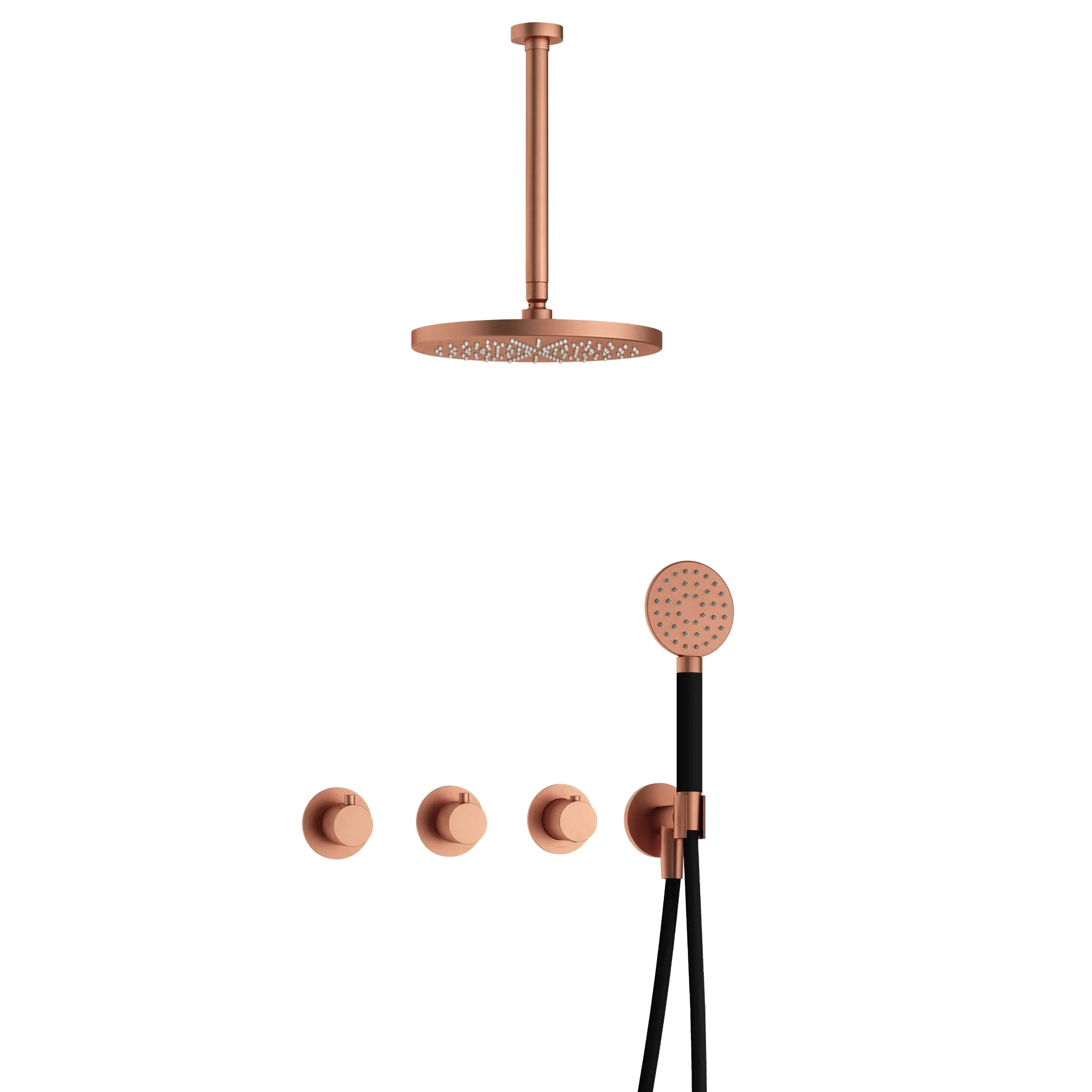Deze complete regendoucheset van Hotbath uit de serie Cobber kunt u precies samenstellen zoals u dat wenst. Het afbouwdeel is voorzien van 3 draaiknoppen: een voor de watertemperatuur en een om te bepalen of het water uit de hoofddouche of uit de handdouche te laten stromen. Iedere set wordt geleverd met de gehele inbouwbox en externe schakelaars. De set is verkrijgbaar in verschillende kleuren. Deze set is voorzien van een plafondbuis 30 cm, hoofddouche 30 cm en een ronde handdouche. Let op: De hoofddouches met een diameter 20 cm hebben minimaal een CW3 ketel nodig om dit systeem zo goed mogelijk te laten werken. Voor hoofddouches met een diameter van 25 cm of groter, geldt een CW4 systeem of hoger.
