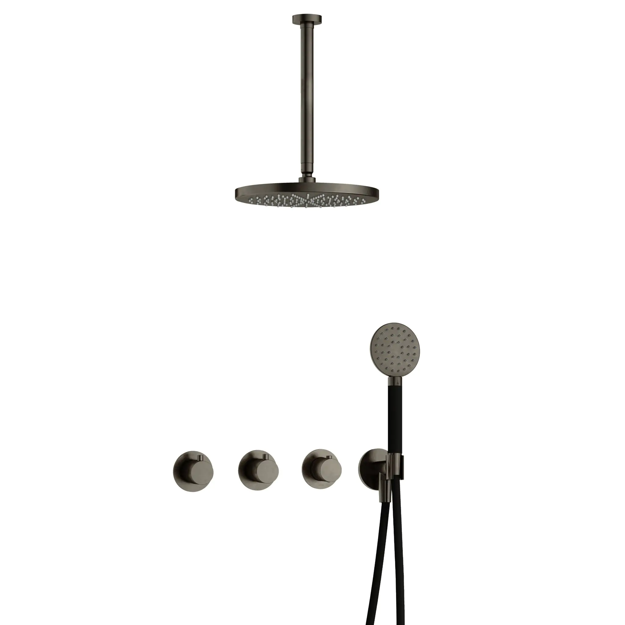 Deze complete regendoucheset van Hotbath uit de serie Cobber kunt u precies samenstellen zoals u dat wenst. Het afbouwdeel is voorzien van 3 draaiknoppen: een voor de watertemperatuur en een om te bepalen of het water uit de hoofddouche of uit de handdouche te laten stromen. Iedere set wordt geleverd met de gehele inbouwbox en externe schakelaars. De set is verkrijgbaar in verschillende kleuren. Deze set is voorzien van een plafondbuis 30 cm, hoofddouche 30 cm en een ronde handdouche. Let op: De hoofddouches met een diameter 20 cm hebben minimaal een CW3 ketel nodig om dit systeem zo goed mogelijk te laten werken. Voor hoofddouches met een diameter van 25 cm of groter, geldt een CW4 systeem of hoger.