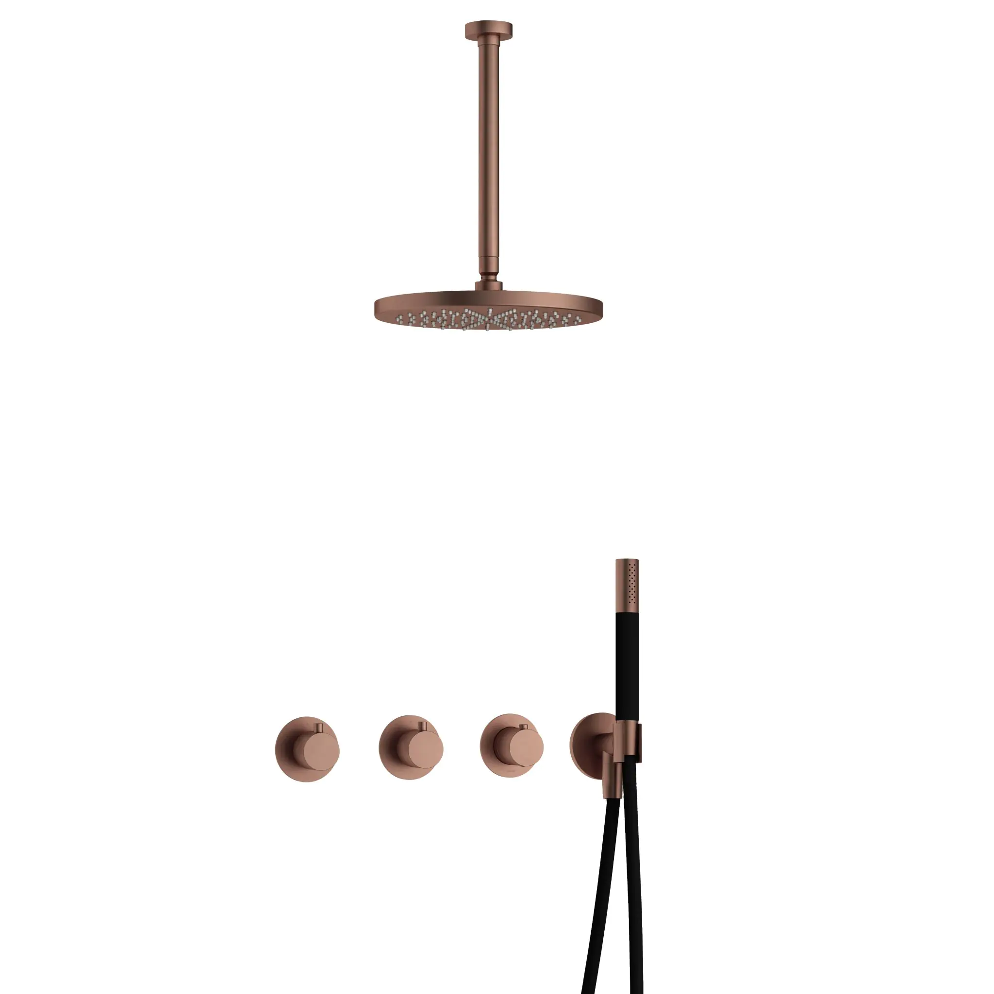 Deze complete regendoucheset van Hotbath uit de serie Cobber kunt u precies samenstellen zoals u dat wenst. Het afbouwdeel is voorzien van 3 draaiknoppen: een voor de watertemperatuur en een om te bepalen of het water uit de hoofddouche of uit de handdouche te laten stromen. Iedere set wordt geleverd met de gehele inbouwbox en externe schakelaars. De set is verkrijgbaar in verschillende kleuren. Deze set is voorzien van een plafondbuis 30 cm, hoofddouche 30 cm en een staafhanddouche. Let op: De hoofddouches met een diameter 20 cm hebben minimaal een CW3 ketel nodig om dit systeem zo goed mogelijk te laten werken. Voor hoofddouches met een diameter van 25 cm of groter, geldt een CW4 systeem of hoger.