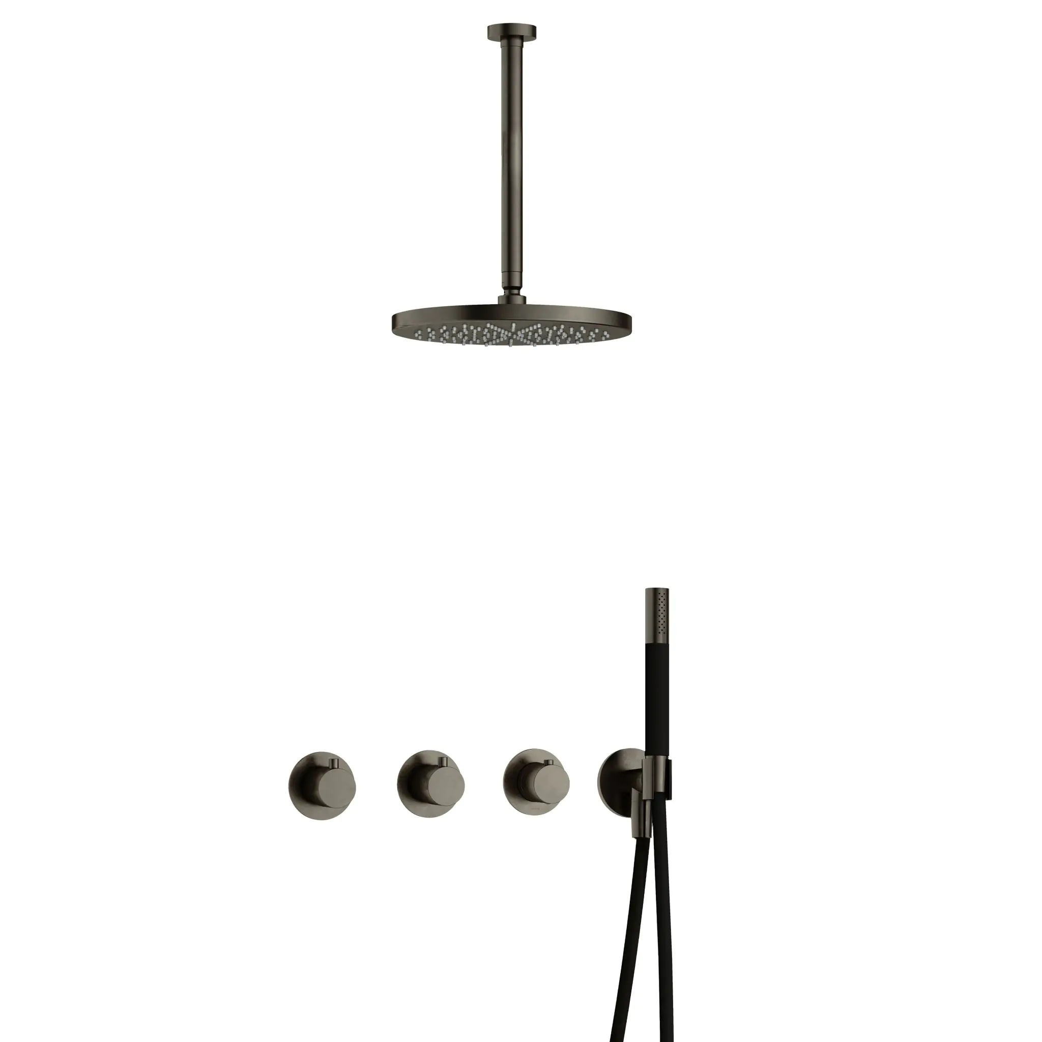 Deze complete regendoucheset van Hotbath uit de serie Cobber kunt u precies samenstellen zoals u dat wenst. Het afbouwdeel is voorzien van 3 draaiknoppen: een voor de watertemperatuur en een om te bepalen of het water uit de hoofddouche of uit de handdouche te laten stromen. Iedere set wordt geleverd met de gehele inbouwbox en externe schakelaars. De set is verkrijgbaar in verschillende kleuren. Deze set is voorzien van een plafondbuis 30 cm, hoofddouche 30 cm en een staafhanddouche. Let op: De hoofddouches met een diameter 20 cm hebben minimaal een CW3 ketel nodig om dit systeem zo goed mogelijk te laten werken. Voor hoofddouches met een diameter van 25 cm of groter, geldt een CW4 systeem of hoger.
