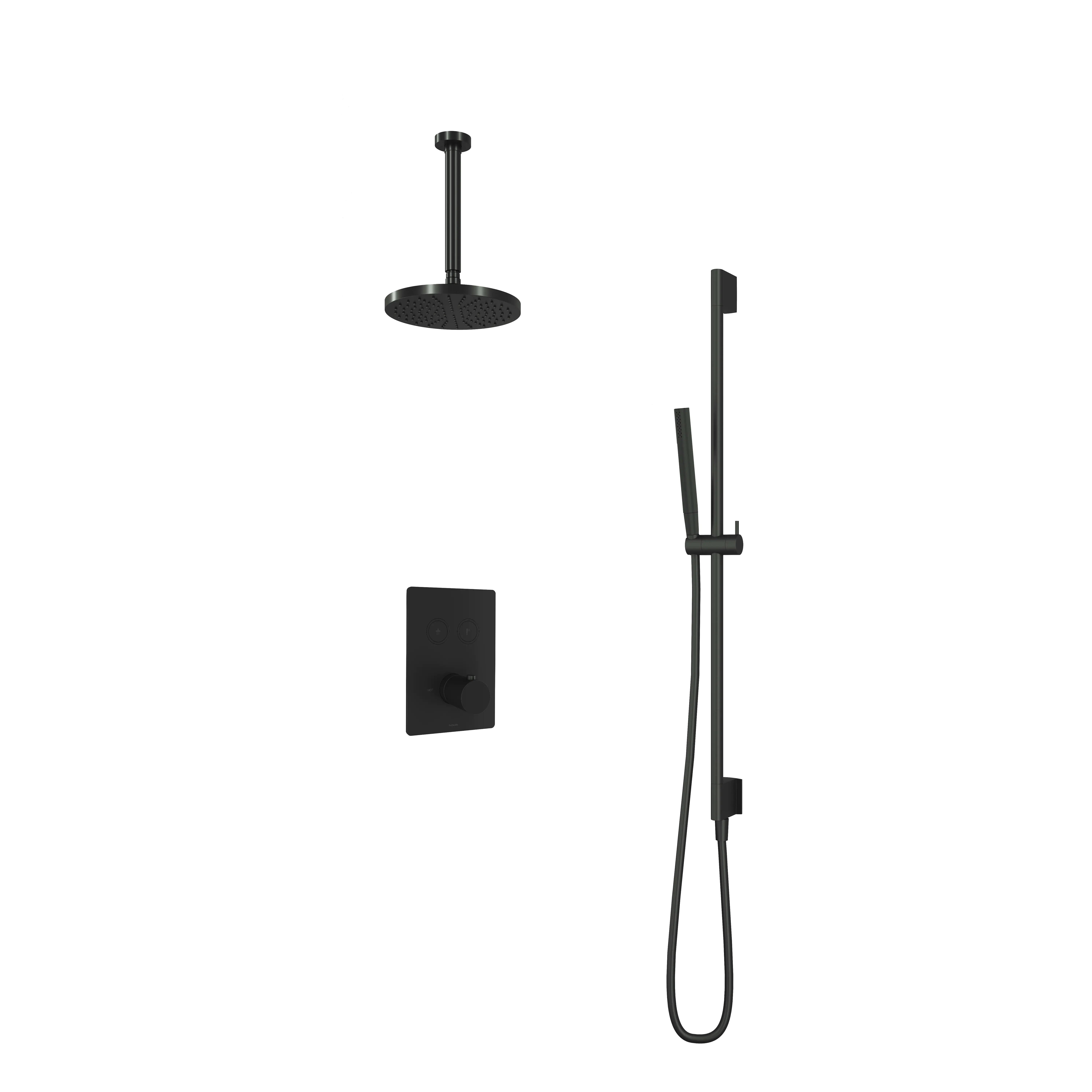 Deze complete regendoucheset van Hotbath uit de serie Cobber kunt u precies samenstellen zoals u dat wenst. Deze set is kenmerkend voor de ingebouwde thermostaat met 2 pushbuttons. Iedere set wordt geleverd met de gehele inbouwbox en externe schakelaars. De set is verkrijgbaar in verschillende kleuren. Deze set is voorzien van een plafondbuis 30 cm, hoofddouche 20 cm en een glijstang met staafhanddouche. Let op: De hoofddouches met een diameter 20 cm hebben minimaal een CW3 ketel nodig om dit systeem zo goed mogelijk te laten werken. Voor hoofddouches met een diameter van 25 cm of groter, geldt een CW4 systeem of hoger.