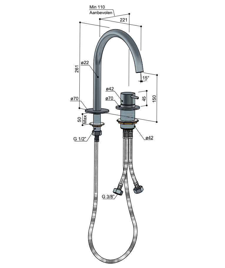 Deze mooie wastafelmengkraan komt uit de Cobber serie. De kraan past door de strakke vormgeving bij elke wastafel. Dankzij het mooie Italiaanse design is het een perfecte toevoeging voor elke ruimte. De kraan is gemaakt van messing. Het binnenwerk is gemaakt van Flühs, dat zorgt voor een binnenwerk van hoge kwaliteit. De combinatie van de volledige messing cartridge en keramische schijven zorgt voor een goede bediening van het sluiten, regelen en omstellen van de waterstroom.De unieke gepatenteerde productie maken dat het product lang mee gaat. De kraan is 26.1 cm hoog, 2.2 cm breed en is 15 cm hoog tot aan de uitloop. Met een mengkraan draait u aan de hendel om zelf tot de juiste temperatuur te komen. Door de hendel te draaien, wordt warm en koud water met elkaar gemengd tot een gewenste temperatuur. Omdat de kraan ook nog eens beschikbaar is in vele kleuren, is er altijd een uitvoering naar wens en passend bij uw interieur.