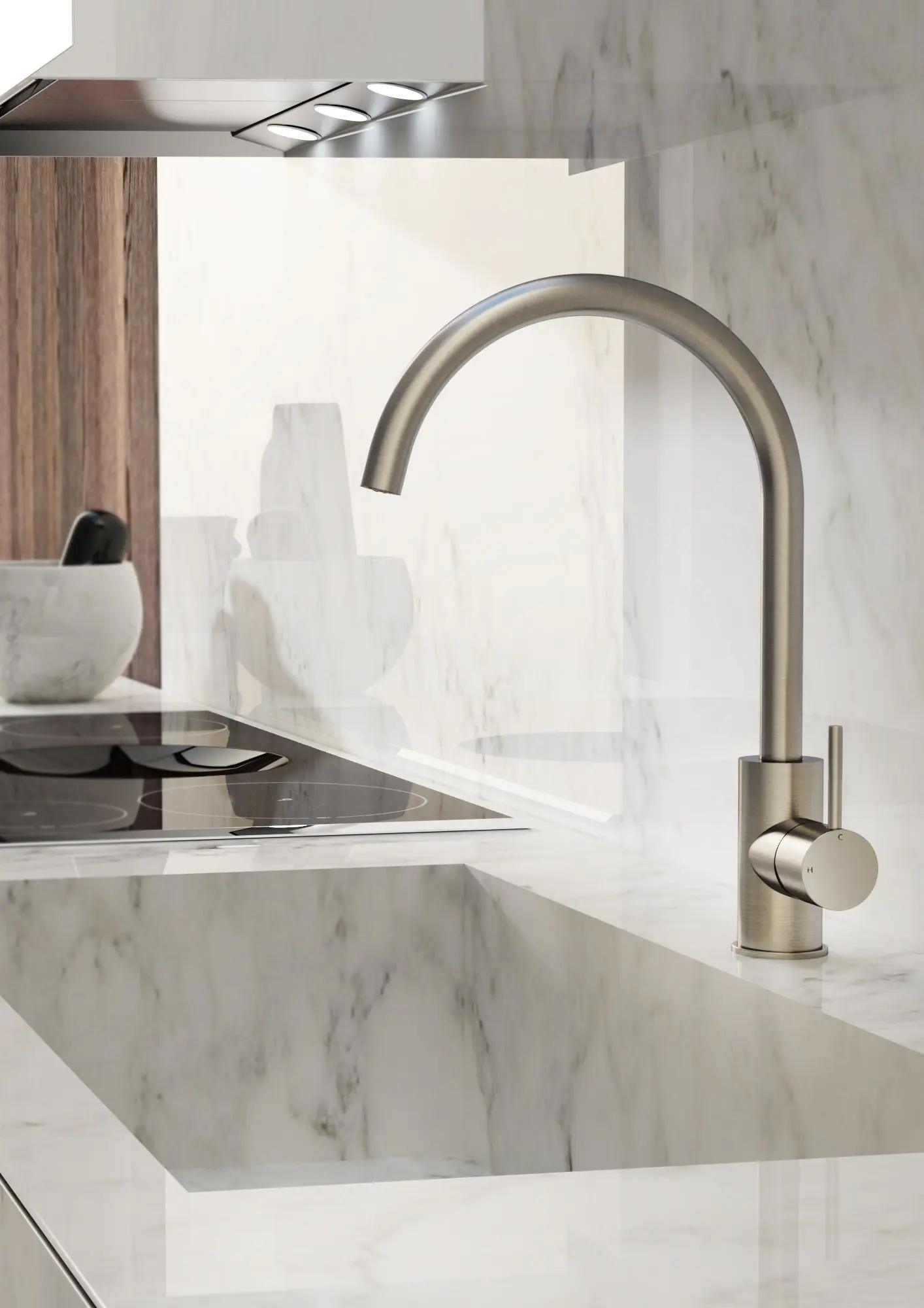 Deze Cobber keukenmengkraan van her merk Hotbath onderscheidt zich door zijn moderne design en elegante afwerking. Door de opvallende zwanenhals maakt het uw stijl in de keuken helemaal af. Super handig in gebruik door de draaibare uitloop. Een mengkraan is een speciaal soort kraan, ontworpen om door menging van koud en heet leidingwater water van een aangename temperatuur uit de kraan of douchekop te laten stromen. De temperatuur van het water kan geregeld worden door aparte draaiknoppen voor het koude en hete water, door een gecombineerde regelknop voor debiet en temperatuur of automatisch door het instellen van een gebouwde thermostaat. De kraan heeft een keramisch binnenwerk, dit houdt de hendel jarenlang soepel in zijn beweging om water door te laten en de kraan goed te sluiten.