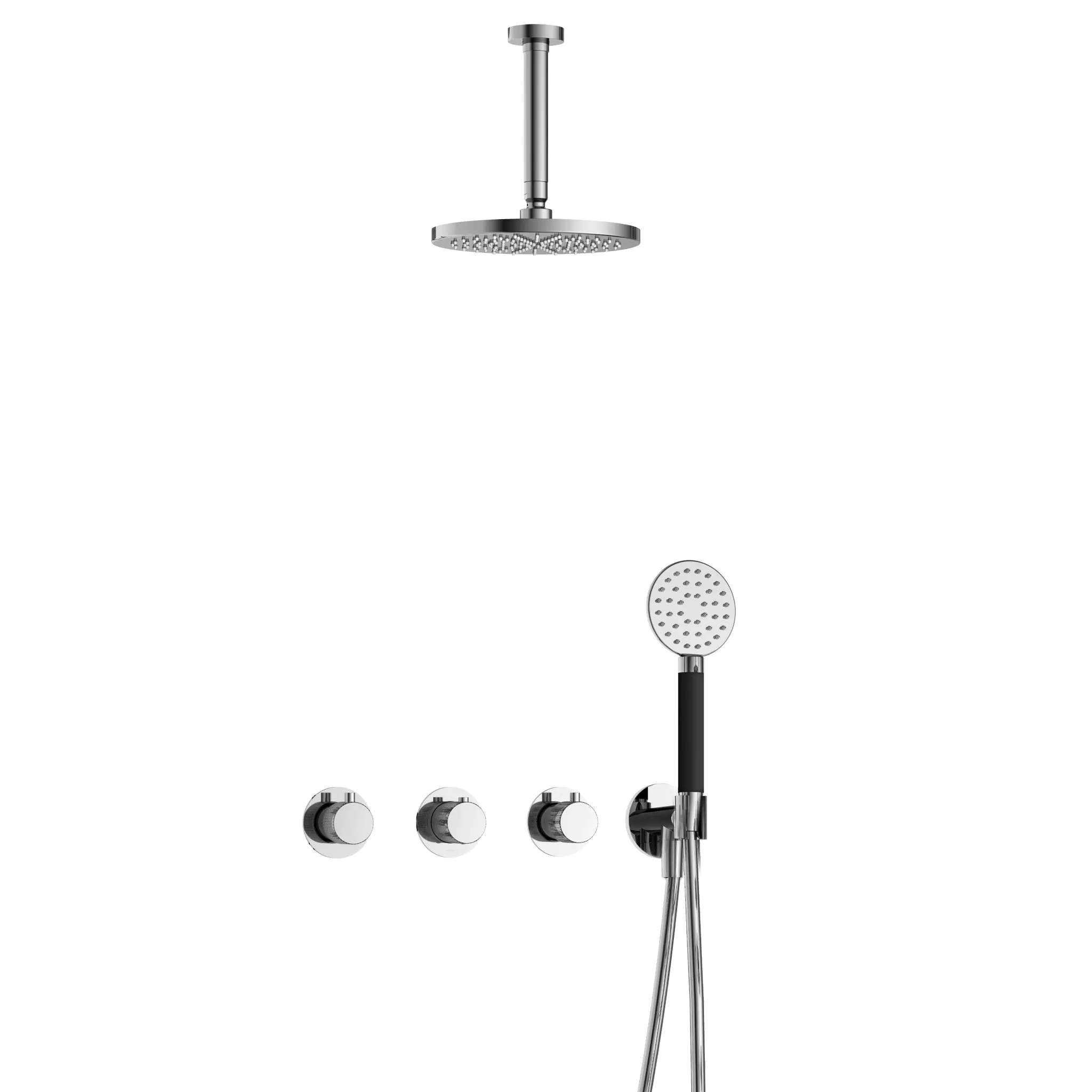 Deze complete regendoucheset van Hotbath uit de serie Cobber X kunt u precies samenstellen zoals u dat wenst. Het afbouwdeel is voorzien van 3 draaiknoppen: een voor de watertemperatuur en een om te bepalen of het water uit de hoofddouche of uit de handdouche te laten stromen. Iedere set wordt geleverd met de gehele inbouwbox en externe schakelaars. De set is verkrijgbaar in verschillende kleuren. Deze set is voorzien van een plafondbuis 15 cm, hoofddouche 20 cm en een ronde handdouche. Let op: De hoofddouches met een diameter 20 cm hebben minimaal een CW3 ketel nodig om dit systeem zo goed mogelijk te laten werken. Voor hoofddouches met een diameter van 25 cm of groter, geldt een CW4 systeem of hoger.