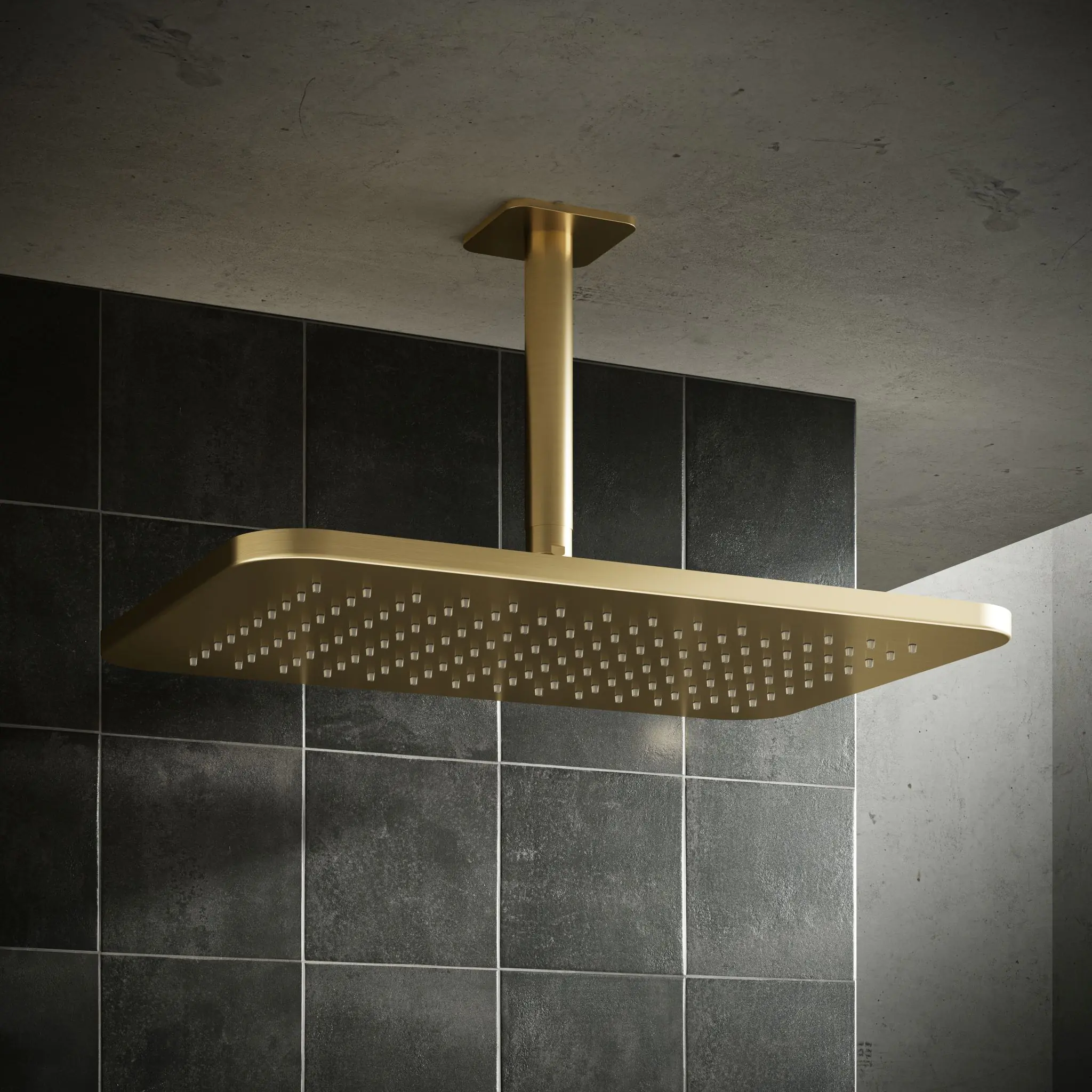 Deze mooie vierkante hoofddouche hoort bij de Gal serie van Hotbath. De hoofddouche is gemaakt van Messing, een materiaal dat goed tegen vocht en warmte kan. Het is dan ook uitermate geschikt als hoofddouche. Als extra toevoeging heeft het nog een PVD-coating. Dat is vloeibaar verdampt metaal dat als een dunne laag wordt aangebracht over het product en de kleur heen. Op deze manier blijven producten en kleuren lang beschermd. PVD is extra krasbestendig en goed bestand tegen schoonmaakmiddelen. De hoofddouche is rechthoekig en is 27 bij 40 cm en is anderhalve cm dik. Let op dat er geen wandarm of plafonduitloop bij zit en dat apart besteld moet worden. De hoofddouche beschikt over het Shower Power Systeem. Dat zorgt voor een gelijke verdeling van het water waardoor u met weinig water het gevoel heeft dat u meer gebruikt. Voor deze hoofddouche is minimaal een CW3 ketel systeem nodig om dat goed te laten werken.