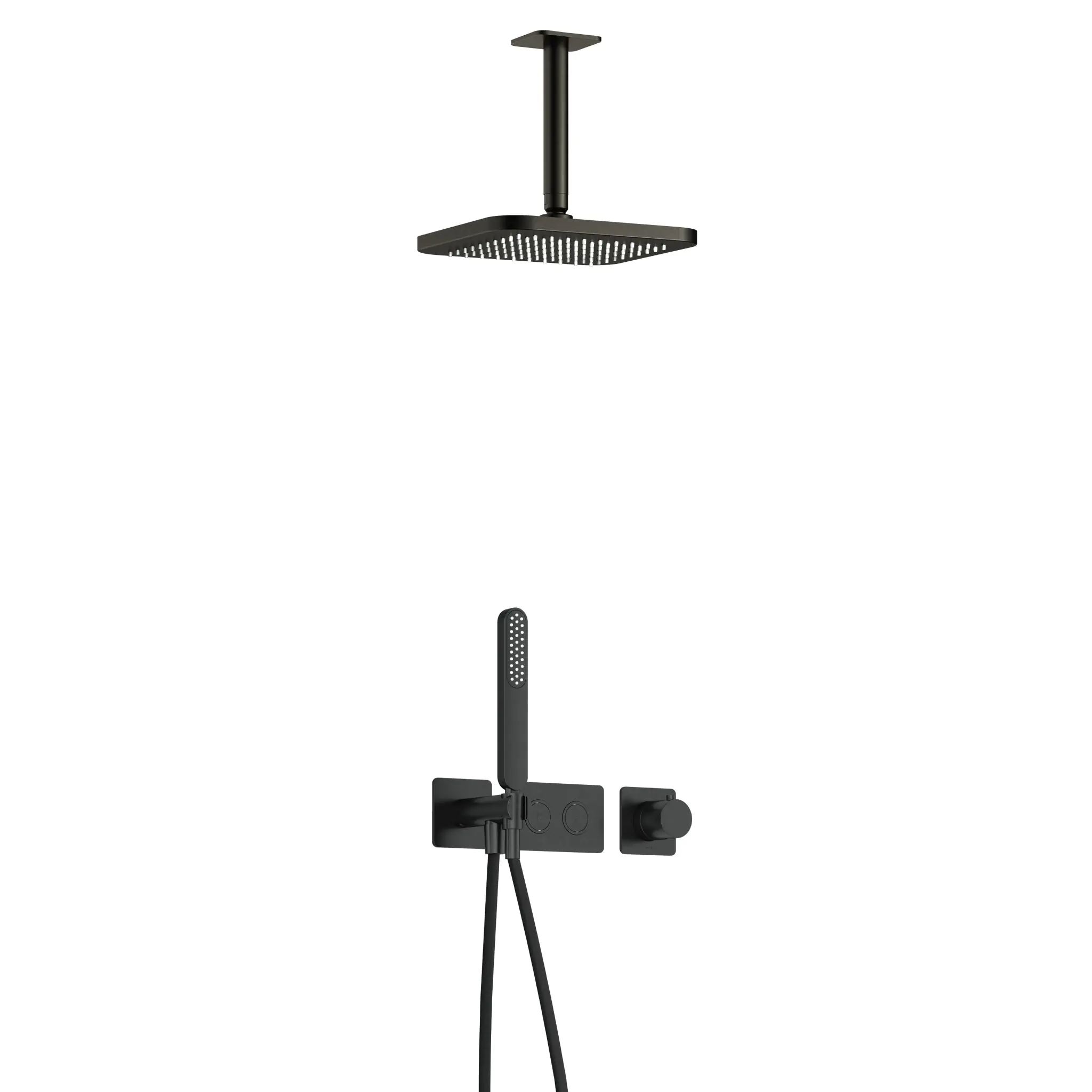Deze complete regendoucheset van Hotbath Gal kunt u precies samenstellen zoals u dat wenst. De bediening van deze douche inbouwset is eenvoudig dankzij de twee pushbuttons rond de thermostaatkraan. Hiermee kun je de douche gemakkelijk aan- en uitzetten en de watertemperatuur aanpassen. Iedere set wordt geleverd met de gehele inbouwbox en externe schakelaars. De set is verkrijgbaar in verschillende kleuren. Deze set is voorzien van een plafondbuis 15 cm, hoofddouche 22x22 cm en een staafhanddouche. Let op: De hoofddouches met een diameter 20 cm hebben minimaal een CW3 ketel nodig om dit systeem zo goed mogelijk te laten werken. Voor hoofddouches met een diameter van 25 cm of groter, geldt een CW4 systeem of hoger.