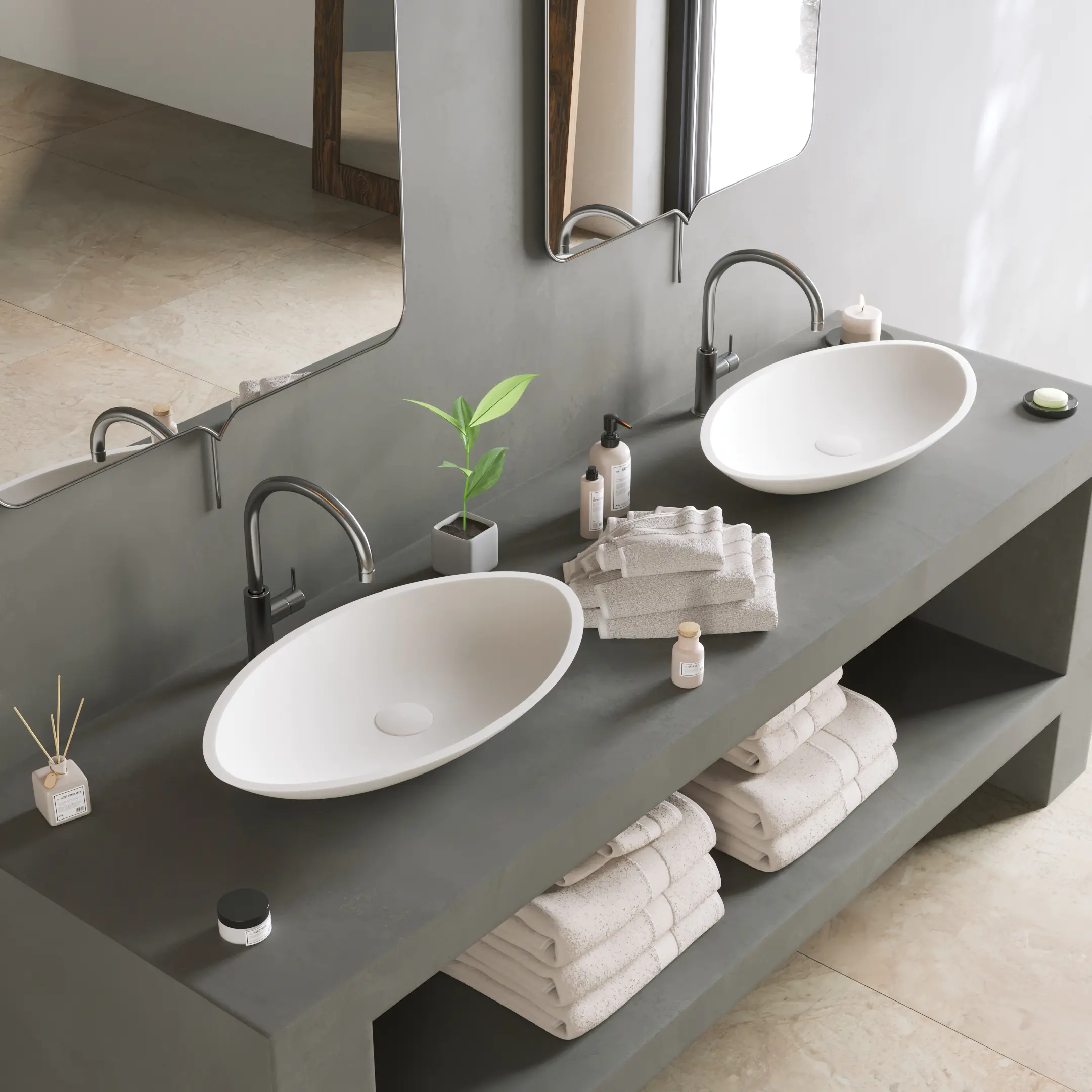 Deze opbouw waskom is geproduceerd in de kleur mat wit en heeft een ovale vorm. De hoogte van deze waskom bedraagt 9 cm, de breedte 60 cm en de diepte 35 cm. Het matte, fluweelachtige oppervlak van de wasbak voelt prettig aan en is makkelijk schoon te maken en te onderhouden.