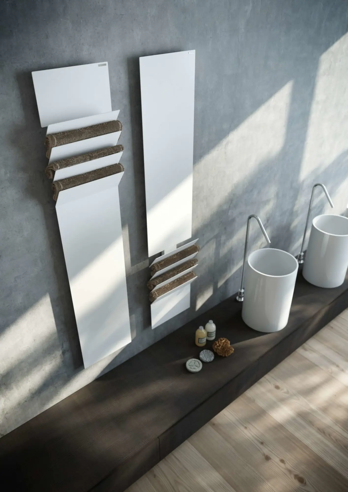 De FLAPS is een combinatie van een mooie designradiator en een handdoekbeugel. Gebaseerd op het ontwerp van ontwerper Victor Vasilev. De strakke, heldere lijnen veranderen wanneer handdoeken in de openingen worden geplaatst. Dit maakt deze designradiator tot een dynamisch designobject in je woning. Deze radiator is gemaakt van recyclebaar aluminium met een hoge warmteoverdracht. De vlakke voorplaat is 3 mm dik en heeft 4 schuine functionele openingen (flappen). U kunt de openingen aan de boven- of onderkant kiezen. De radiator is verkrijgbaar in een lengte van 350mm en 2 verschillende hoogtes. De radiator is voorzien van een standaard 50mm onderaansluiting. De ventilatieopening en het ophangmateriaal zijn inbegrepen. Na een grondige voorbehandeling wordt de radiator voorzien van een poeder epoxy laag.Optioneel kan gekozen worden voor een programmeerbare thermostaat met RF ontvanger, EL.BEDIENING.07. In dat geval kan de radiator als hoofdverwarming worden gebruikt.