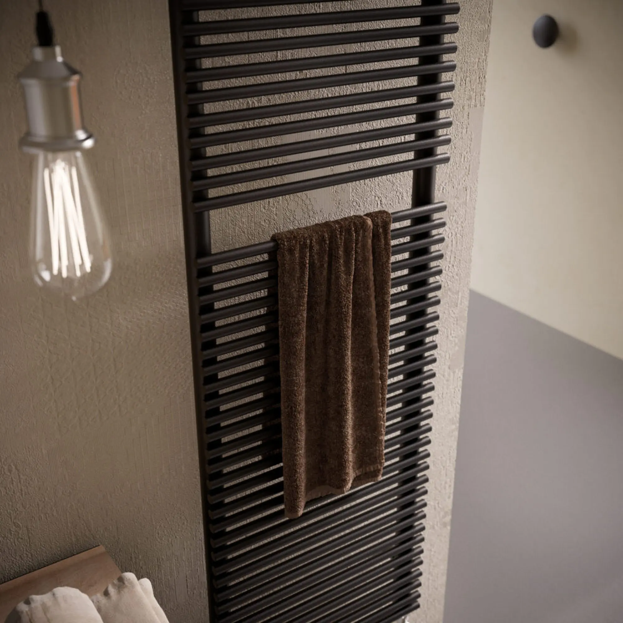 Badkamerradiator Plein is gemaakt van recyclebaar staal en heeft een fraai, strak design. Een krachtige radiator door de vele buizen, die functioneert als een onafhankelijk meubelstuk in de moderne badkamer. Kenmerken van deze radiator zijn een ontwerp met eenvoud en een optimale warmteafgifte. De PLEIN is opgebouwd uit twee verticale collectorbuizen met daarop horizontale buizen en is verkrijgbaar in twee verschillende hoogtematen en breedtematen. De standaard kleur van de radiator is Sanitairwit. Daarnaast is de radiator leverbaar in bijna elke gewenste RAL kleur en een aantal speciale kleuren. De ophanging is in de kleur van de radiator en wordt samen met de ontluchting meegeleverd. De radiator wordt na een grondige roestwerende voorbehandeling voorzien van een poederepoxylaag. Deze radiator wordt standaard geleverd met de witte thermostaat EL.BEDIENING.08