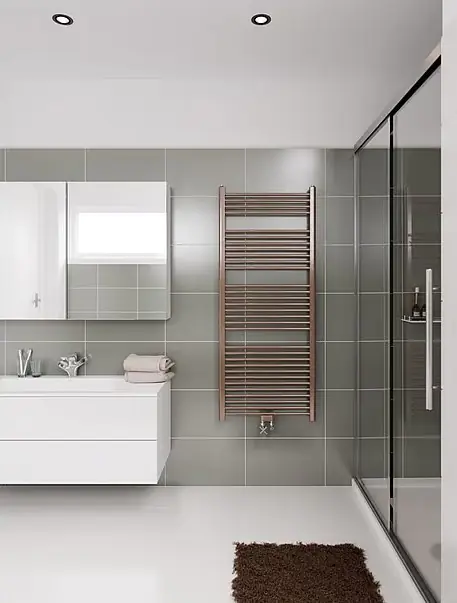 Let op! Houd er rekening mee dat de kleur of afmeting mogelijk afwijkt van wat op de afbeelding wordt getoond. De Rondo Lux is, zoals de naam al doet vermoeden, een luxe badkamerradiator. Met zijn rechte ronde elementen is er voldoende ruimte om handdoeken te verwarmen. De Rondo Lux is opgebouwd uit twee verticale D-vormige collectorbuizen met daartussen rechte ronde horizontale buizen. Indien de 50mm onderaansluiting niet wordt gebruikt dan geeft het onderste element minder warmte af dan de overige elementen. De ophanging bestaat uit metalen consoles en is in de kleur van de radiator. Deze worden samen met het ontluchtingsventiel meegeleverd. De radiator wordt na een grondige roestwerende voorbehandeling voorzien van een poeder-epoxylaag. Deze radiator wordt standaard geleverd met de witte thermostaat EL.BEDIENING.08.