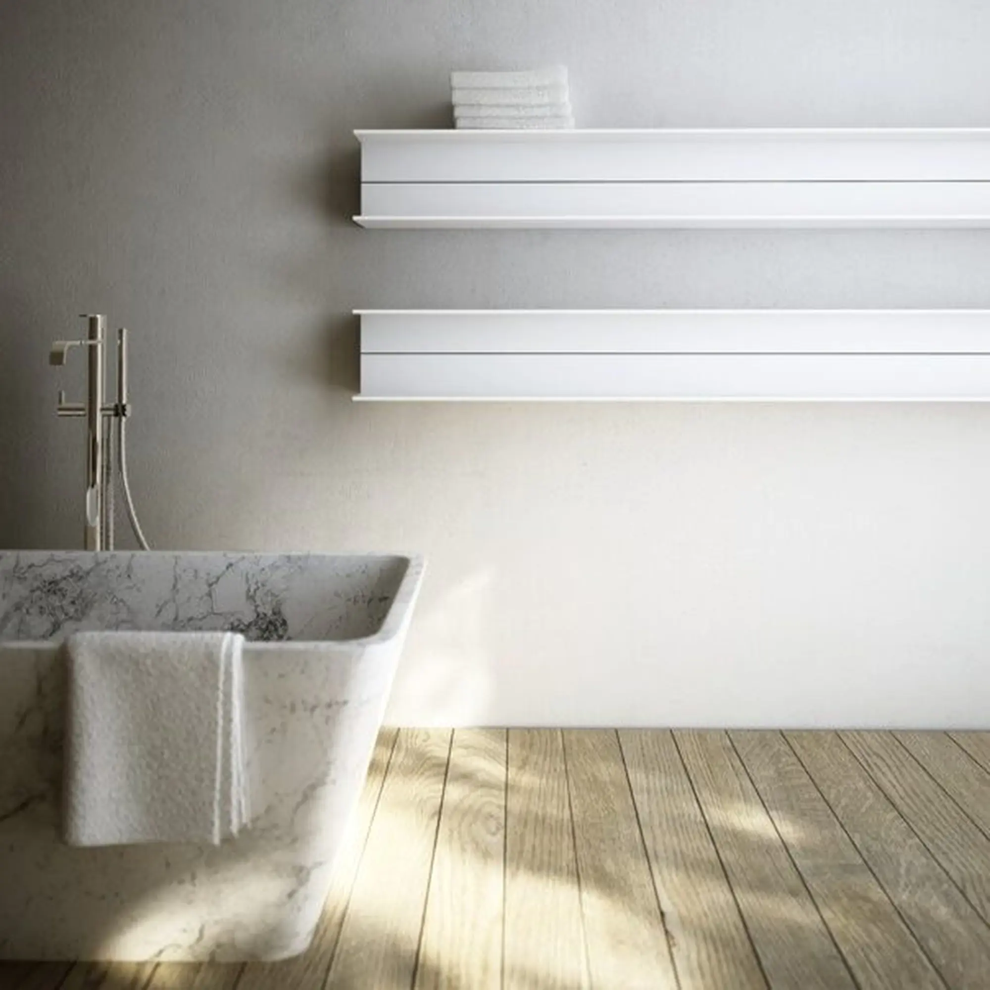 Niet zomaar een radiator, maar een veelzijdig meubel dat past in iedere ruimte in huis; dat is de Serie T. De ontwerpers Matteo Thun en Antonio Rodriguez wilden met een enkel stuk aluminium een letterlijk en figuurlijk warm object realiseren. En dat is gelukt, de radiator is te gebruiken als een meubelstuk in de badkamer of in de gang, keuken of woonkamer. Door verschillende uitvoeringen gaat het ontwerp perfect op in het interieur. Verrassend en veelzijdig! Alle types zijn leverbaar in verschillende lengte- en hoogtematen. De veelzijdigheid van het design van de Serie T maakt dat deze modellen niet alleen geschikt zijn voor de badkamer, maar ook voor andere ruimtes in huis. Een optimale combinatie tussen warmte, functionaliteit en design. De Serie T wordt geleverd met aansluitset, ophanging en ontluchting. De radiator wordt na een grondige voorbehandeling voorzien van een poeder-epoxylaag. Standaard wordt de Serie T geleverd in sanitairwit. Levering in andere kleuren is mogelijk. Alle afgiftes zijn conform EN442. Een horizontale radiator met een vlakke voorkant. Optioneel kan er gekozen worden voor 3 verschillende uitsparingen aan de achterzijde. Dit geeft als extra functionaliteit de mogelijkheid om er handdoeken overheen te hangen.