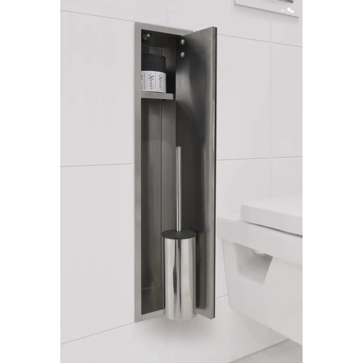 Erger jij je ook aan die toiletborstel die naast het toilet staat? Dat is nu verleden tijd dankzij de LoooX inbouw toiletborstelhouder. Praktisch, hygiënisch en stijlvol! De LoooX Closed serie beschikt over een reeks opbergsystemen voor de toiletborstel. Dankzij deze serie is de toiletborstel nu mooi weggewerkt maar toch binnen handbereik. Kies je voor geborsteld rvs of voor een betegelbare versie, waarbij de toiletborstel betegeld in de muur is weggewerkt? Er is veel mogelijk! Leuk detail: boven de toiletborstel is een opbergvak beschikbaar. Deze extra opbergruimte is ideaal om bijvoorbeeld een wc-rol in op te bergen. Ook is het mogelijk om boven de geïntegreerde toiletborstel een wc-rolhouder te plaatsen. Bekijk onze mogelijkheden!