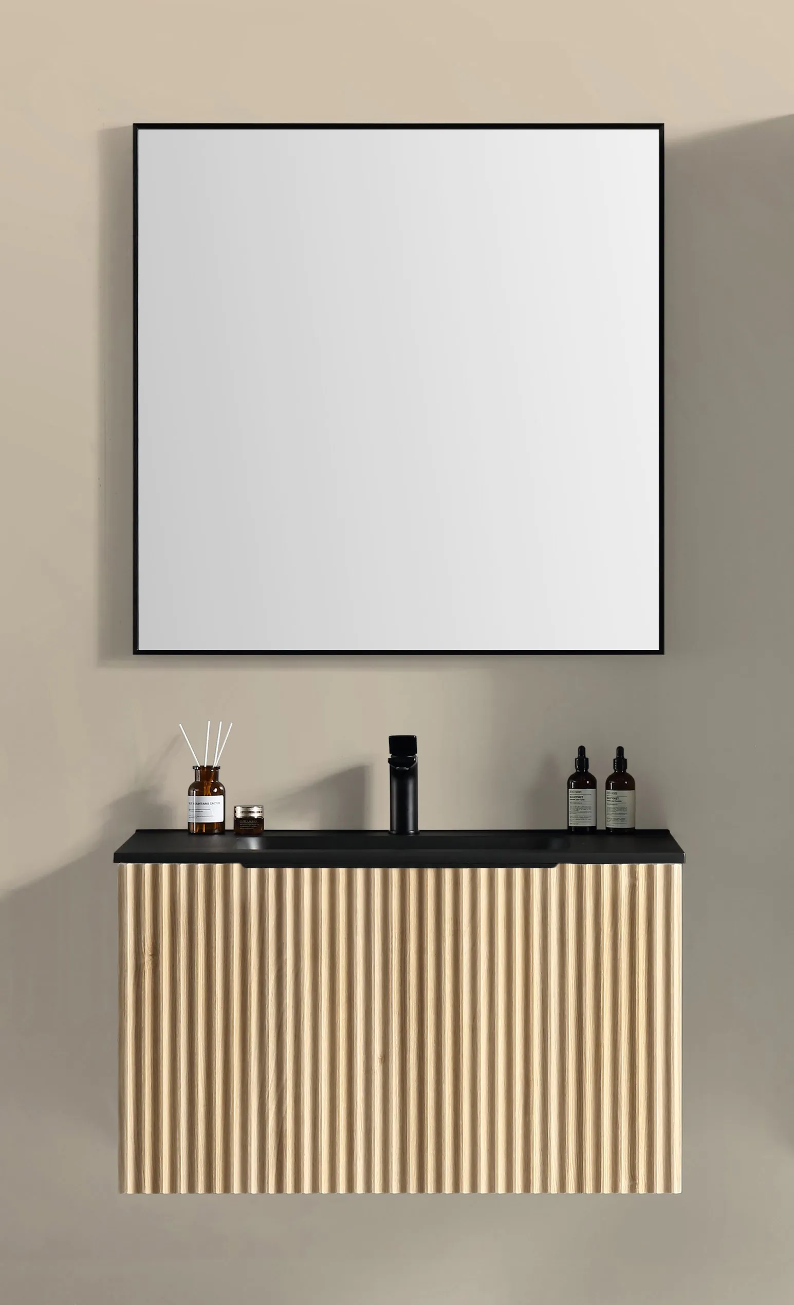 De set wordt compleet geleverd met een bijpassende mat zwarte wastafel. Deze wastafel is niet alleen een lust voor het oog, maar ook bijzonder gemakkelijk te onderhouden. Bovendien zorgt de vierkante spiegel met zwarte lijst voor een harmonieuze en luxe uitstraling in jouw badkamer.
