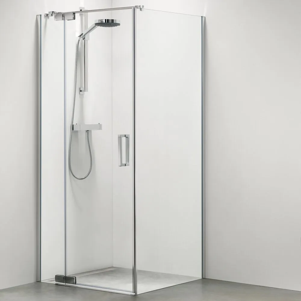 Een swingdeur met zijwand in de Custom serie is beschikbaar in de maten 90*90cm en 100*100cm met 6 mm helder veiligheidsglas.