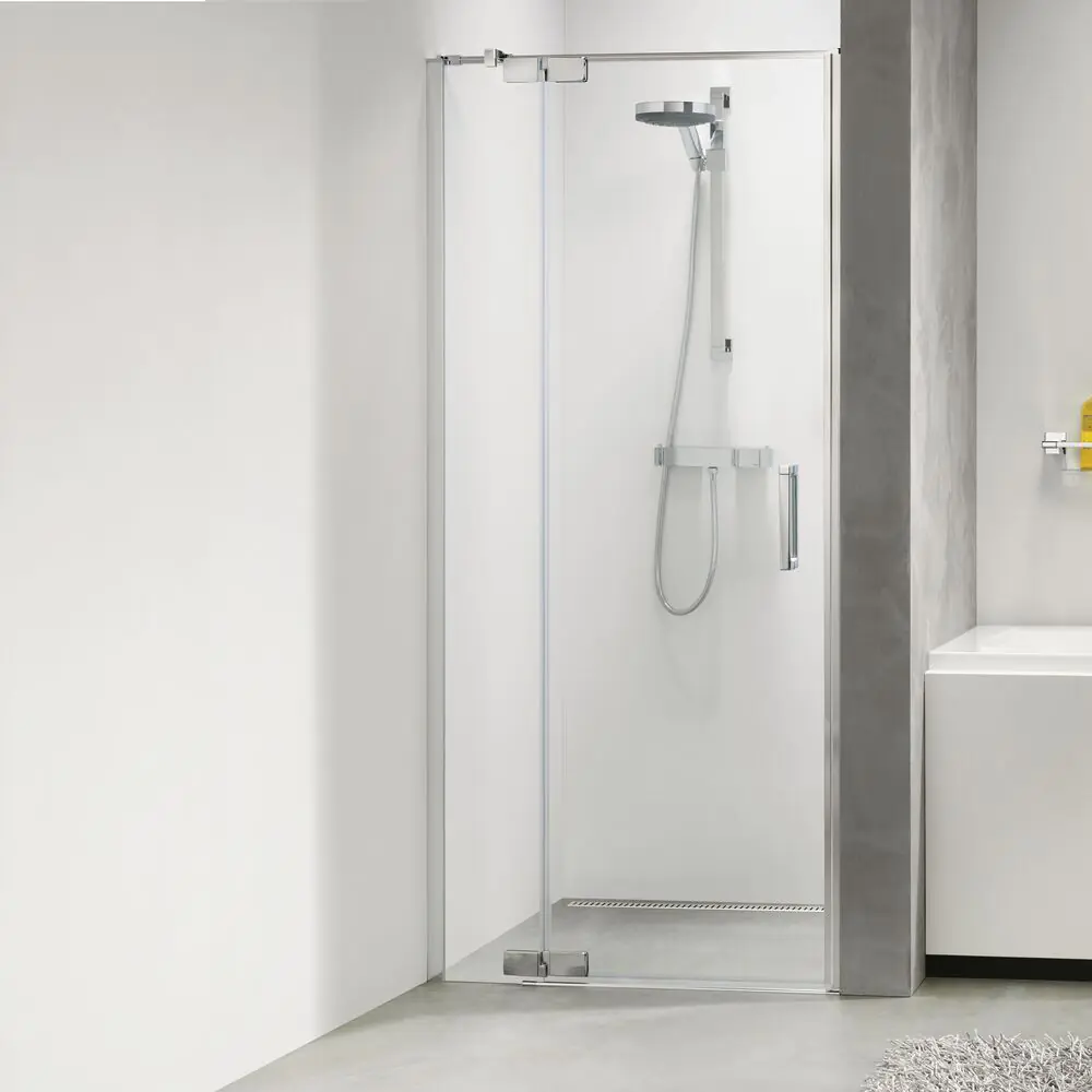 Een swingdeur voor plaatsing in een nis in de Custom serie is beschikbaar in de maten 80cm, 90cm, 100cm en zelfs 120cm met 6 mm helder veiligheidsglas.