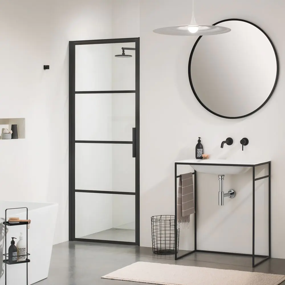 Soho® is een serie douchedeuren en inloopdouches met matzwarte kaders. Samen met de subtiel toegepaste industriële bouten is de inspiratie zichtbaar gebleven. Met bijzonder veel aandacht voor detail, zoals de verborgen scharnieren en de mogelijkheid om de douchedeur ook drempelloos te plaatsen, is deze industriële look succesvol vertaald naar een moderne douche.