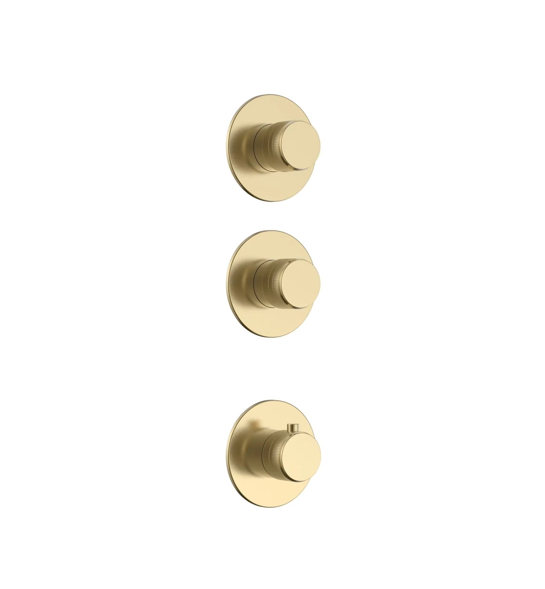 Het Stria-afbouwdeel voor inbouwdouchekraan in geborsteld goud (PVD) combineert modern design met hoogwaardige functionaliteit. Dit afbouwdeel voor thermostatische 2-weg inbouwkraan is uitgerust met 2 stopkranen, ronde knoppen met verfijnde ribbelstructuur en mooie ronde rozetten, die samen een subtiele, luxueuze uitstraling geven.