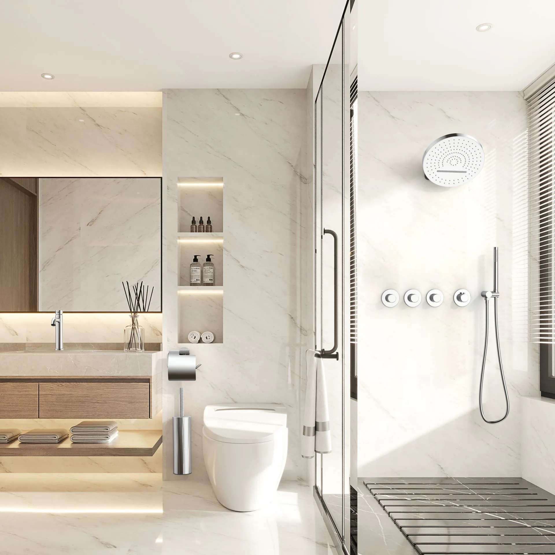 Het Stria-afbouwdeel voor inbouwdouchekraan in chroomkleurige afwerking combineert modern design met hoogwaardige functionaliteit. Dit afbouwdeel voor thermostatische 3-weg inbouwkraan is uitgerust met 3 stopkranen, ronde knoppen met verfijnde ribbelstructuur en mooie ronde rozetten, die samen een subtiele, luxueuze uitstraling geven. Het is gemaakt van hoogwaardig RVS wat zorgt voor duurzaamheid, krasbestendigheid en onderhoudsgemak. Dankzij het strakke, ronde design sluit het afbouwdeel naadloos aan op een moderne badkamerinrichting.
