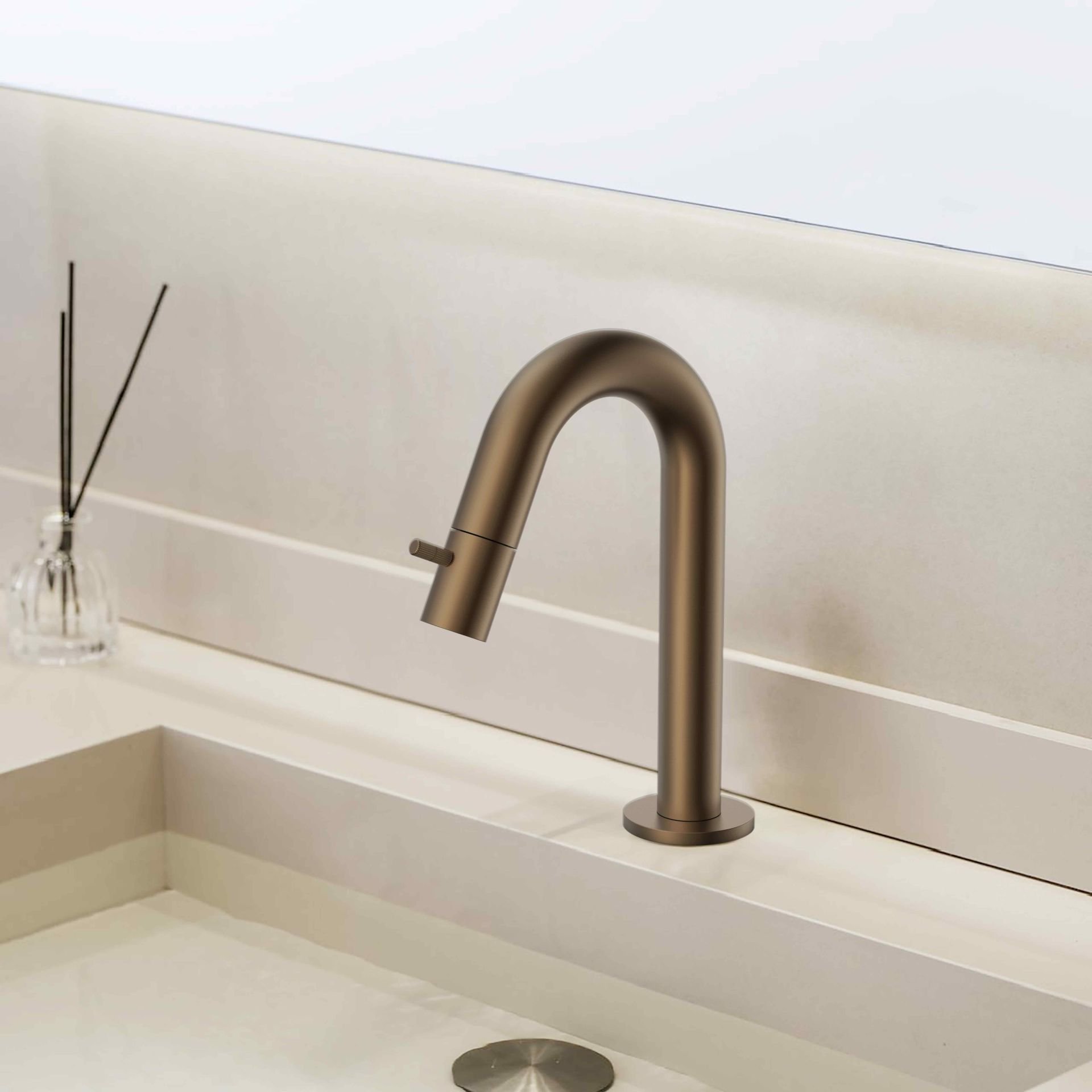 De hendel met verfijnde ribbelstructuur voegt een subtiele, luxueuze touch toe en biedt extra grip en comfort. De kraan is vervaardigd uit roestvrij staal (RVS) en afgewerkt met een bruin bronzen PVD-coating, wat zorgt voor een duurzame, kras- en corrosiebestendige afwerking die zijn luxe uitstraling langdurig behoudt. De gebogen uitloop combineert gebruiksgemak met een elegante uitstraling.